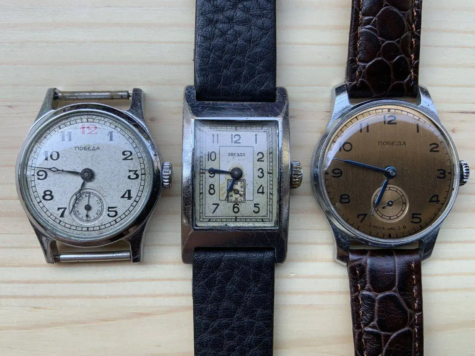 En cuanto al tamaño del Zvezda, decir que, acostumbrado a los Pobeda, me lo esperaba más pequeño. Esta caja “tank” tiene un ancho de asas mayor que un Pobeda clásico (en la foto, lleva una correa de cuero de 18mm, frente a los 16mm del Pobeda) y eso crea el efecto de que no se vea tan pequeño. Supongo que las otras cajas Zvezda (la redonda y la de forma de barril) se verán menores, al tener menor ancho de asas.