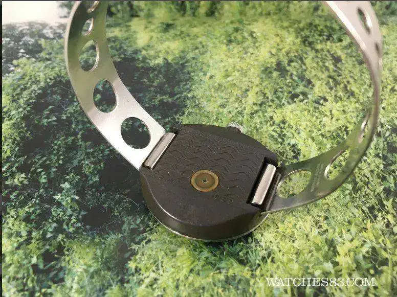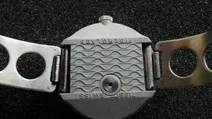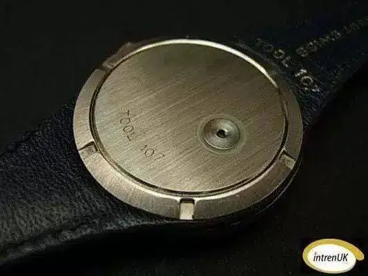 Edito para añadir una foto de la trasera de un Tissot Seastar Seven, caja toda metálica con lo que parece ser un brazalete de cuero de una sola pieza que se fija al reloj por medio de eso que parece ser una arandela roscada (simil tapa de diver) que mantendría en su lugar la parte central del brazalete de cuero.