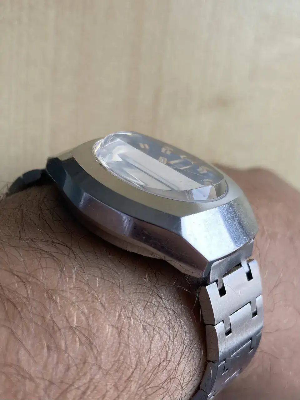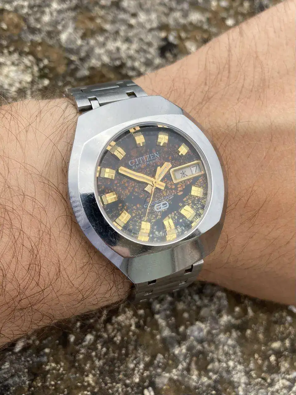 Creo que esa esfera es única y muy osada incluso para los años '70. Un precioso reloj, Denbora, enhorabuena!Hoy voy con el último en entrar. Mi segundo Cosmotron. Electromecánico y con un pedazo de cristal facetado que según como le incida la luz, provoca unos reflejos blanquecinos que afectan un poco a la legibilidad. Cosas de la moda setentera. El diseño del dial a mi me recuerda a como se vería el techo de un bosque muy tupido con la luz del atardecer. (Que cursilón me ha quedado...). En fin, os dejo unas fotos. Buena semana a todos!