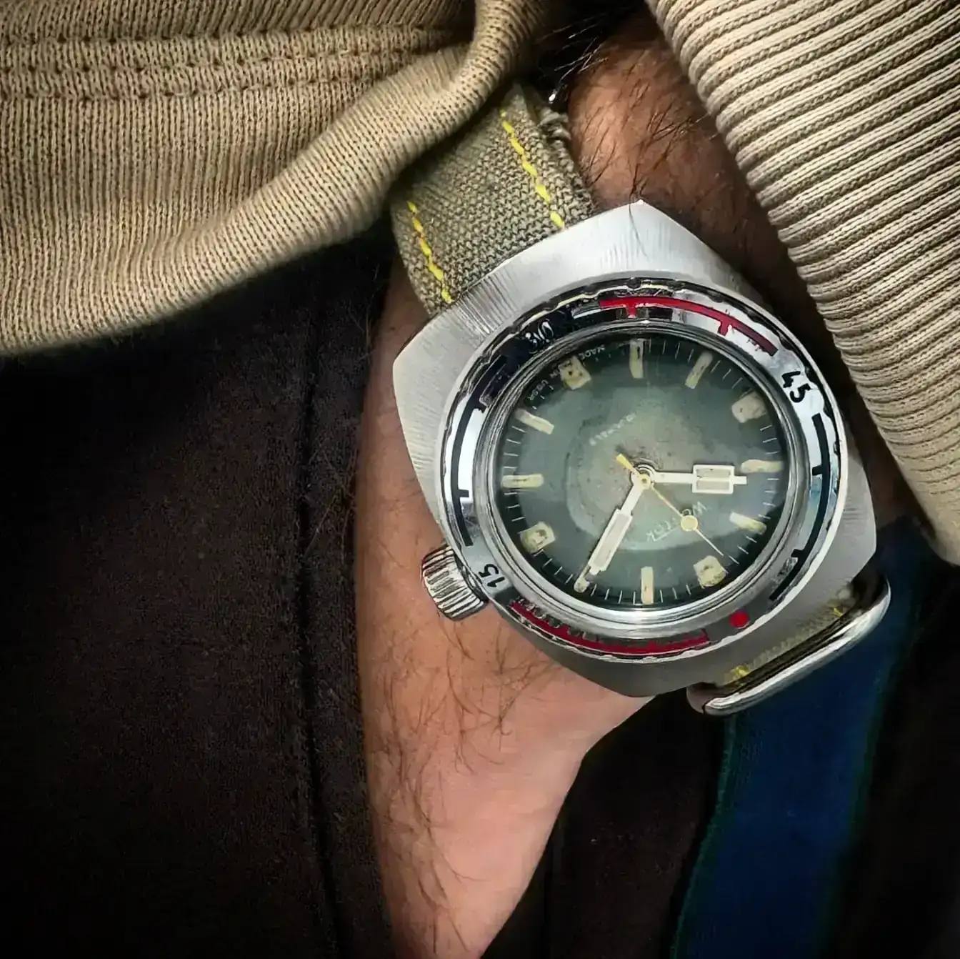 A pesar de considerarlos muy buenos relojes por un precio contenido, a mi tampoco me gustan mucho los actuales. Tengo el Baikal y el Prypiat y apenas me los pongo. Pero los vintage son otra historia, este me encanta, con su lumen aplicado a brochazos, color especial, caja de acero tornasolada... No sé, me encanta.