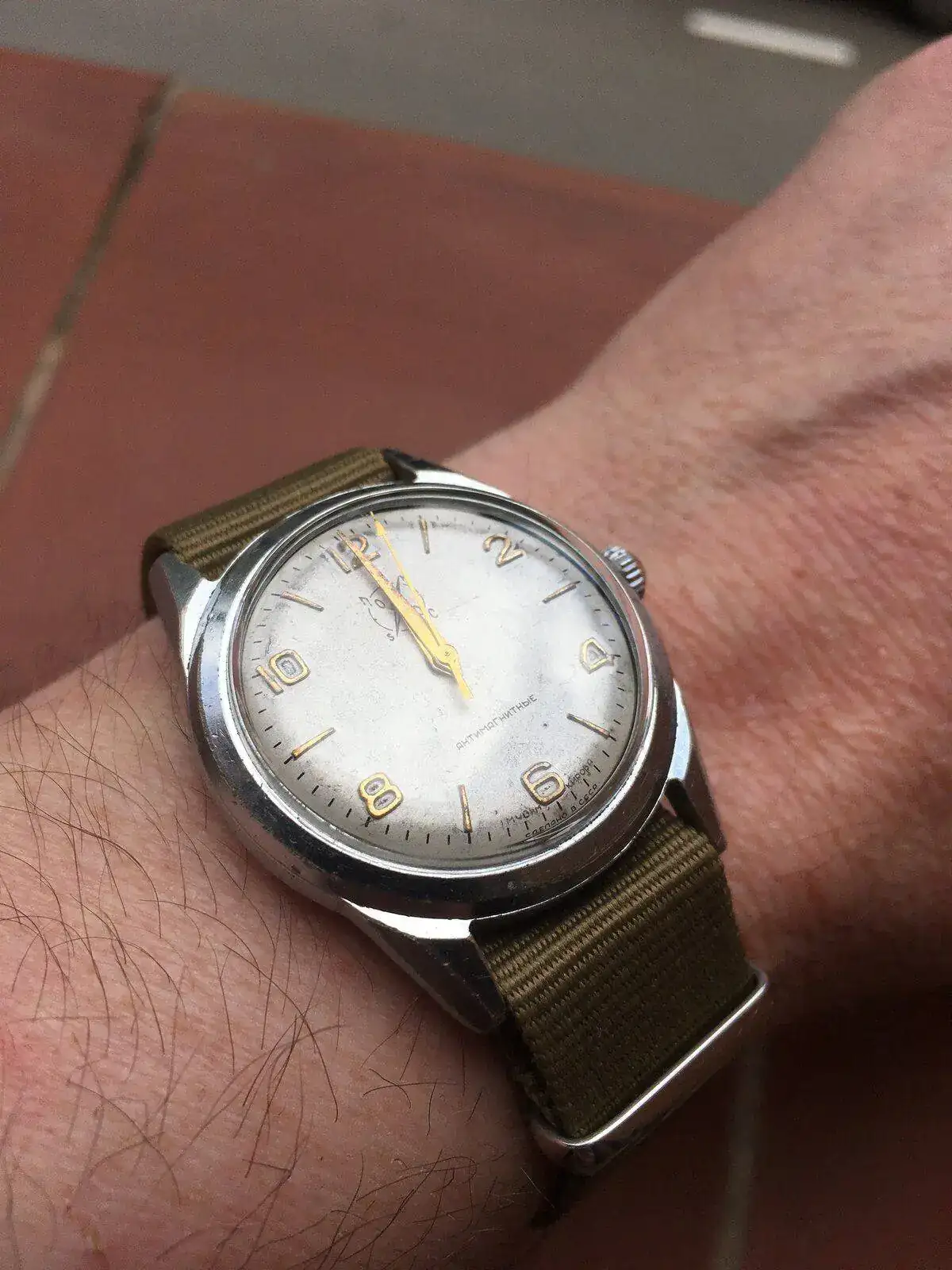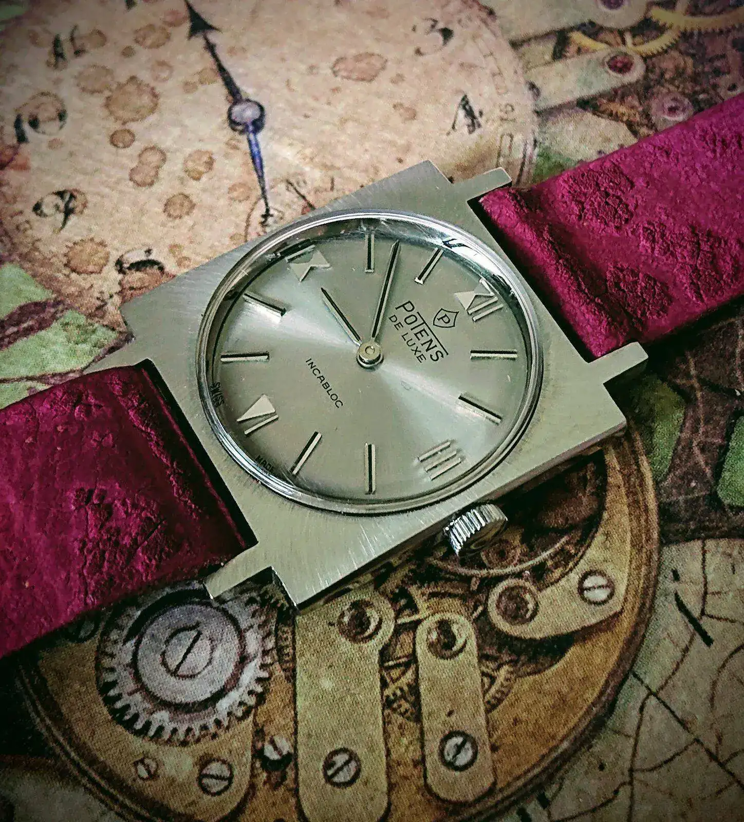 Sí hubiera sabido que era el cumple de Flaco, habría sacado un camarada, pero hoy había elegido este precioso elegante Potens que recibí NOS dé mi estimado y añorado Molotov. Perfecto ejemplo de reloj cuadrondo: caja cuadrada, esfera redonda