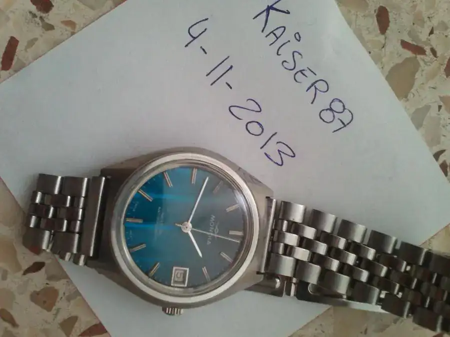 Saco a la venta este precioso Mondia de cuerda manual del año 70, echo en un principio para el mercado asiatico donde tuvieron cierto exito,de 36mm pero muy bien compensados.El armis no sabria asegurar si es original o no,yo diria que si,y plexi con alguna leve marca logica a su edad pero en muy buen estado.Espectacular esfera azul tornasol vertical,lleva un calibre manual FHF 96 de 17 rubis un buen y robusto movimiento que a sido utilizado recientemente por Zeno Watch Basel en alguno de sus modelos Pilot que recuperan calibres antiguos.