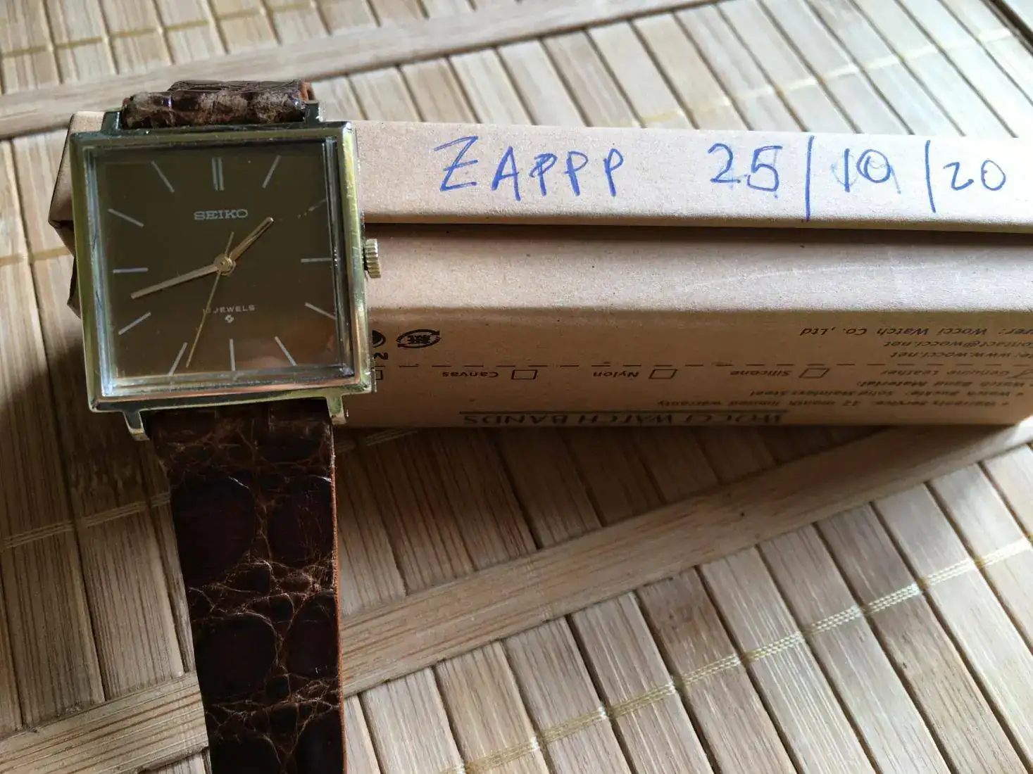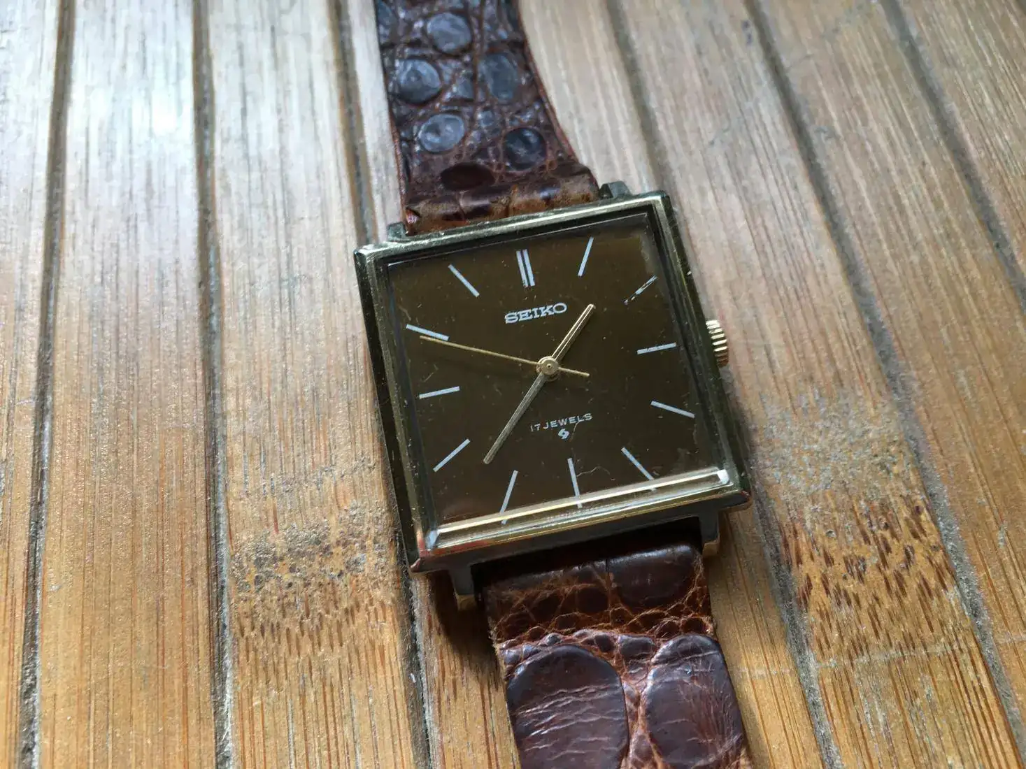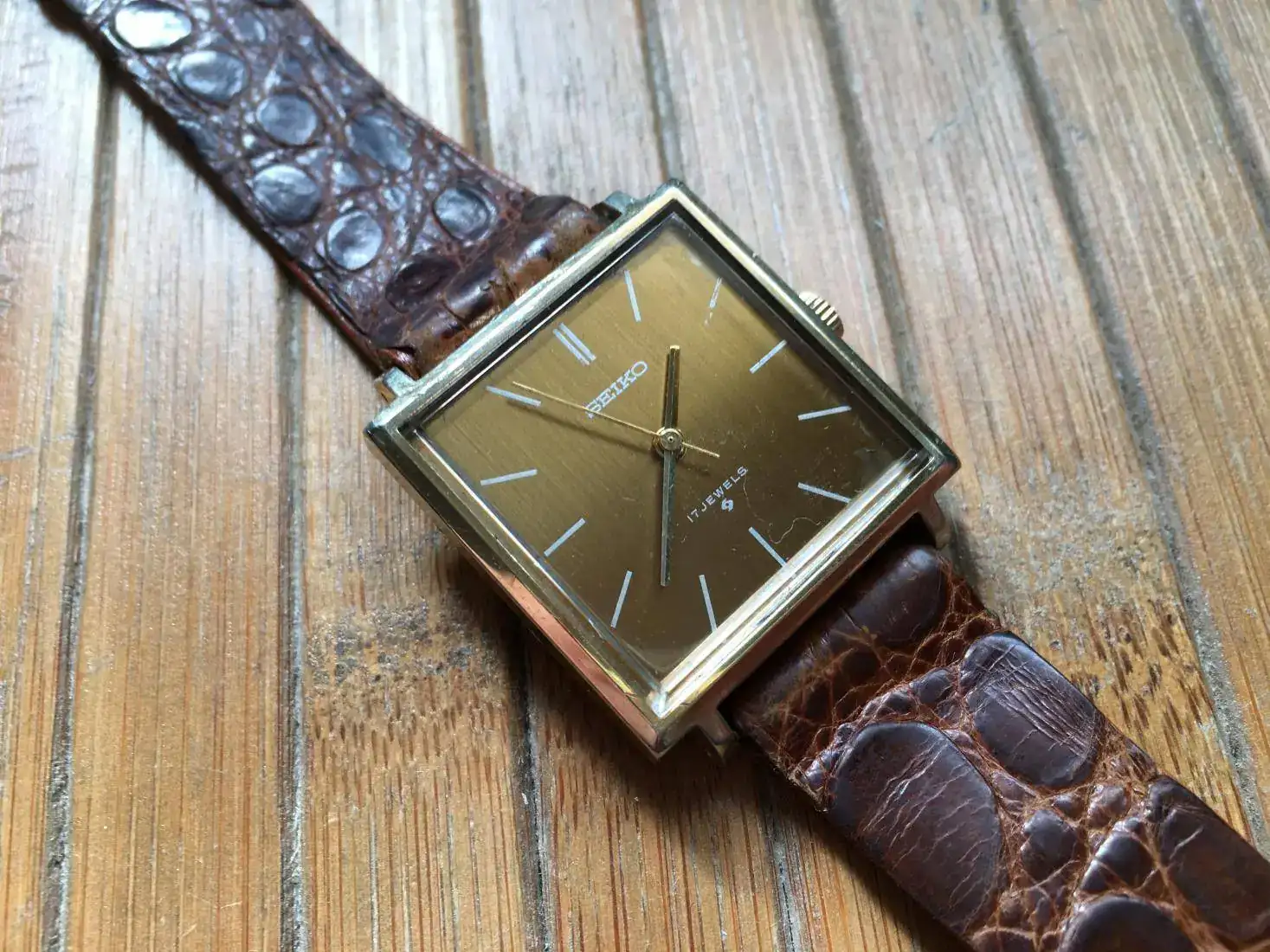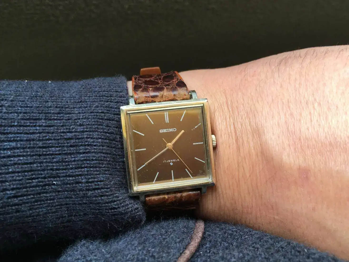 Correa vintage de cocodrilo, con uso pero usable. Es la que le puse porque me parece que le quedaba mejor de las que tenía.
