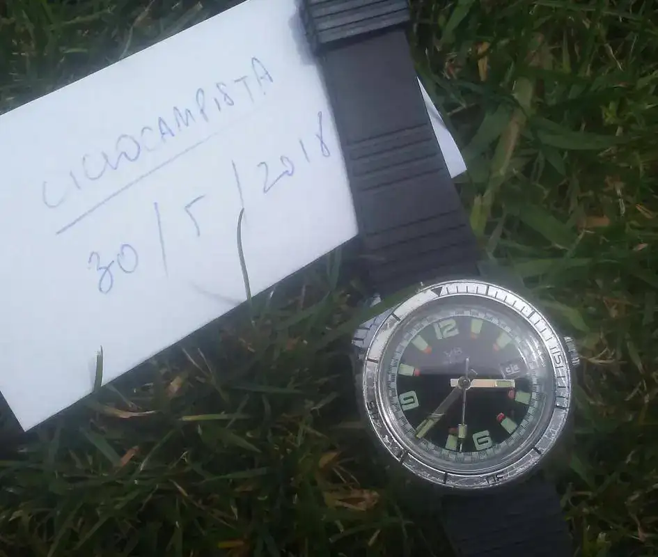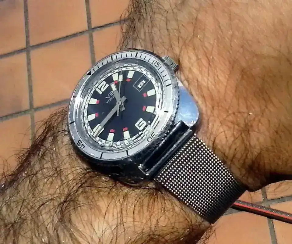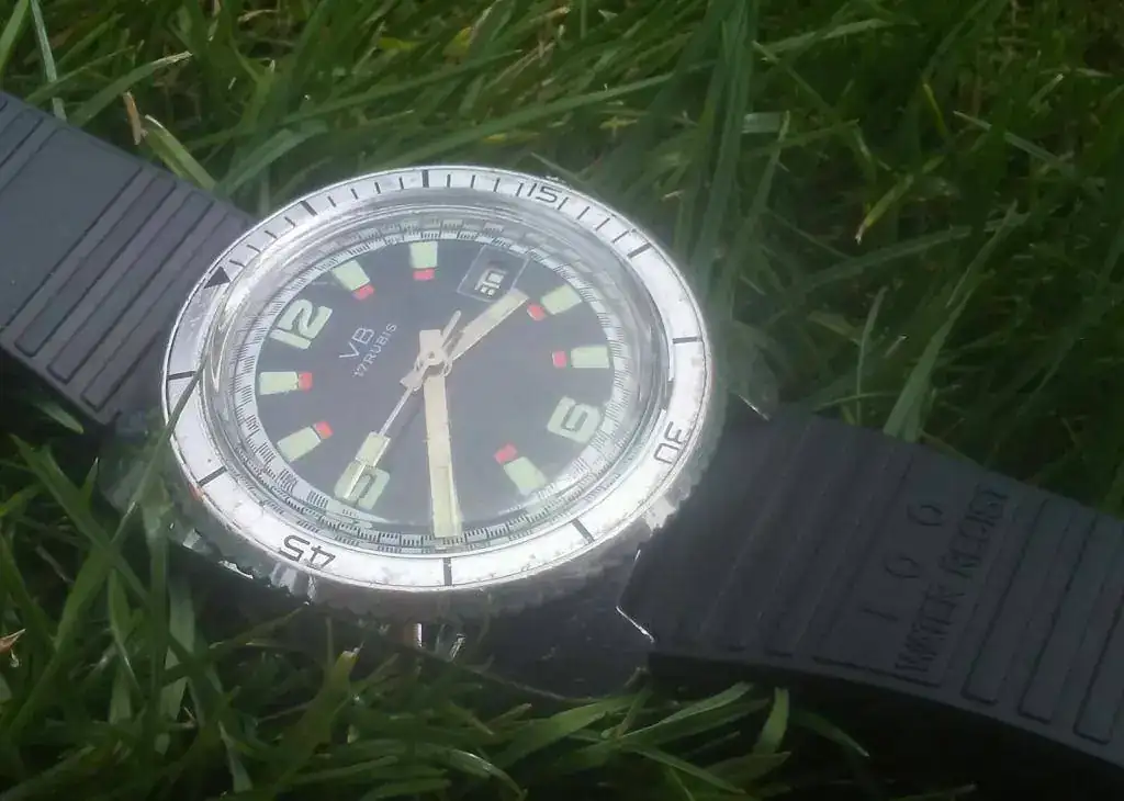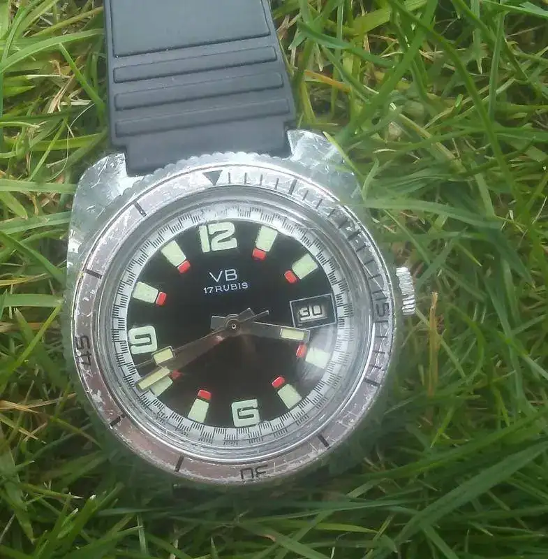 Vendo este diver de fantasía francés VB vintage. Caja de latón cromado, corona no roscada, bisel bidireccional sin clics con insert de aluminio, tapa trasera de acero, calibre de 17 rubíes con fechador. El lumen aún es fuerte.