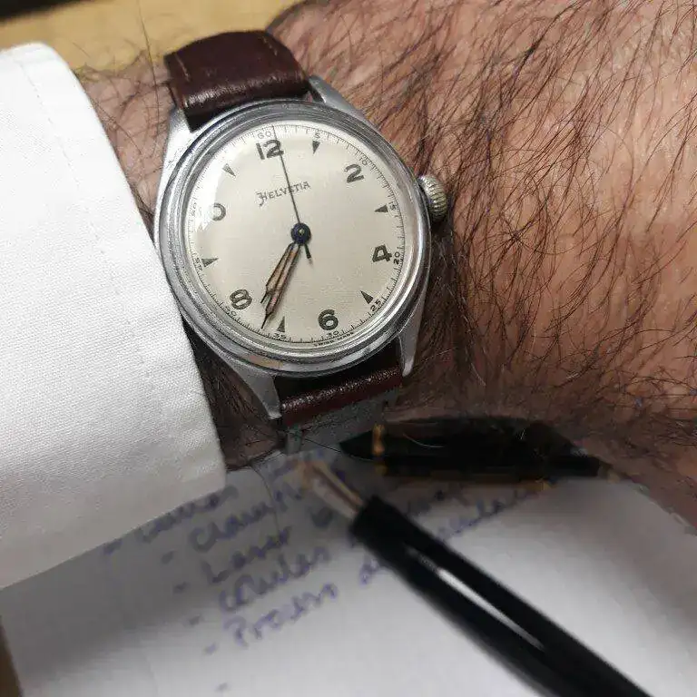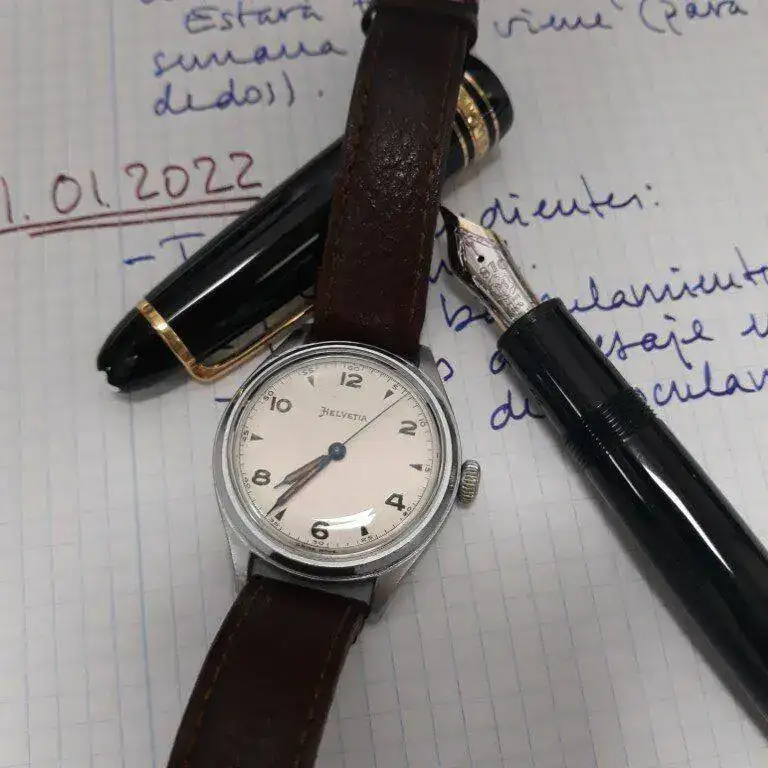 Hoy, como toda la semana, sigo con el Helvetia. Ayer estuve en el relojero para ver cómo podíamos cambiar de correa, que se está rompiendo. Seguramente iré a por una de perlón, de 16 mm. Bueno, aquí van las fotos. La pluma, una Montblanc 146, que ahora llaman Legrand.