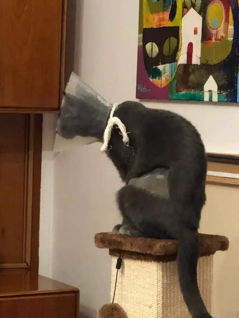 Penica ver a la bella Lola "acampanada" 😰 Me ha recordado a mi moteado, que llevó en varias ocasiones la "tulipa" y nunca le pilló la medida el pobre; también es cierto que era un dálmata gigante y el tamaño de la campana iba en consonancia... Los topetazos que se daba para pasar por las puertas y la cara de susto con que nos miraba, pobrico mío 🥺