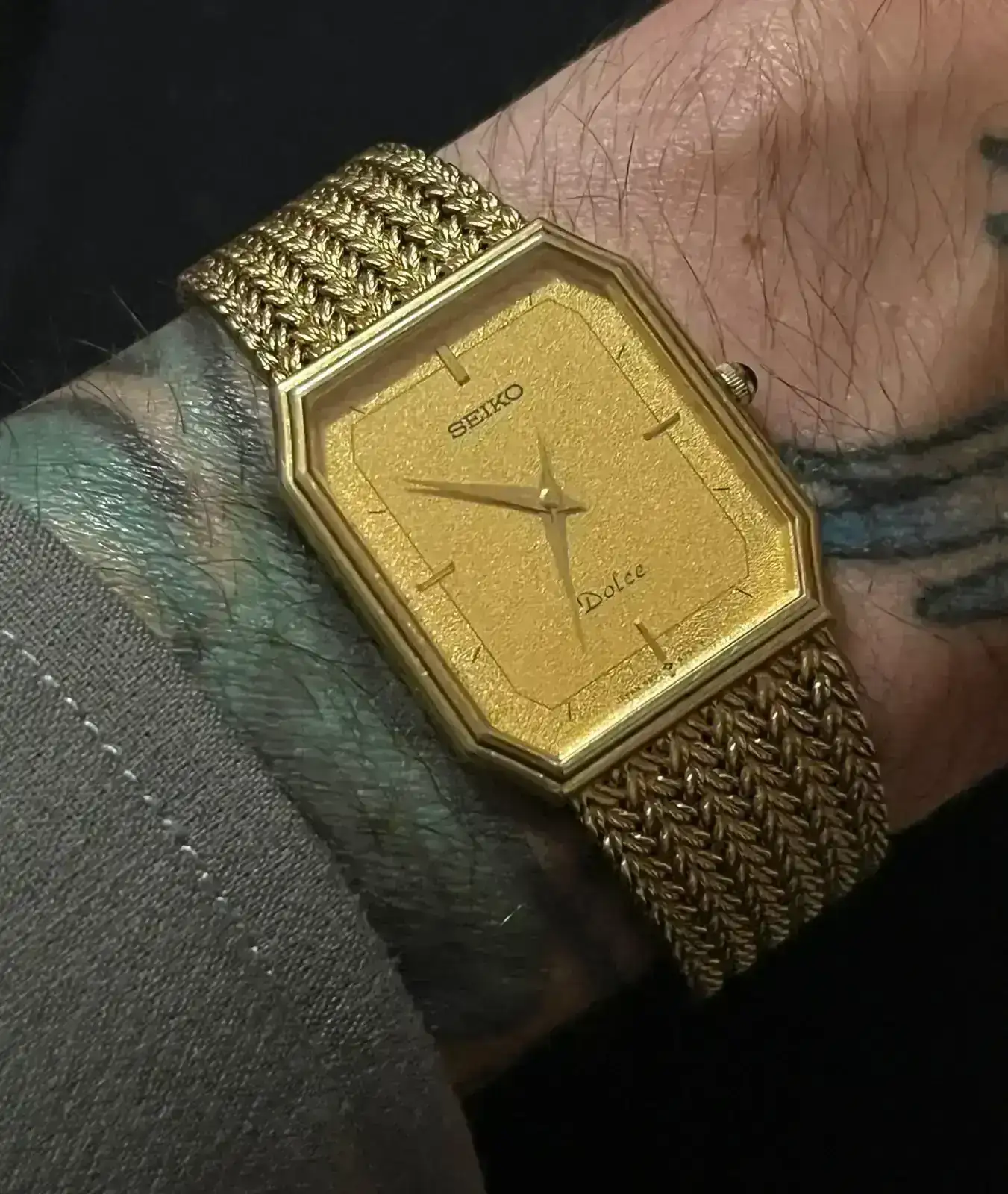 Pues a mi me gusta (que malla!!), pero es que me está pasando algo parecido, me empiezan a gustar mucho el diseño de finales de los años '70 y principios de los '80. Muy curioso.Llevo un largo periodo de tiempo totamente embelesado con los relojes con diseños setenteros, brazaletes integrados de malla, mucho oro, pequeños, cajas no redondas... me parecen el sumo de la elegancia (véanse como ejemplos y en lo más alto el Patek Philippe Ellipse, Rolex King Midas...). Pues bien, obsesionado con conseguir algo parecido pero mucho, mucho, muchísimo más económico he podido conseguir este Seiko Dolce (lo que no haya fabricado Seiko...) que ha calmado un poco mis ansias, espero que os guste, aunque también entiendo a quién le parezca un poco hortera (a mi me flipa!):