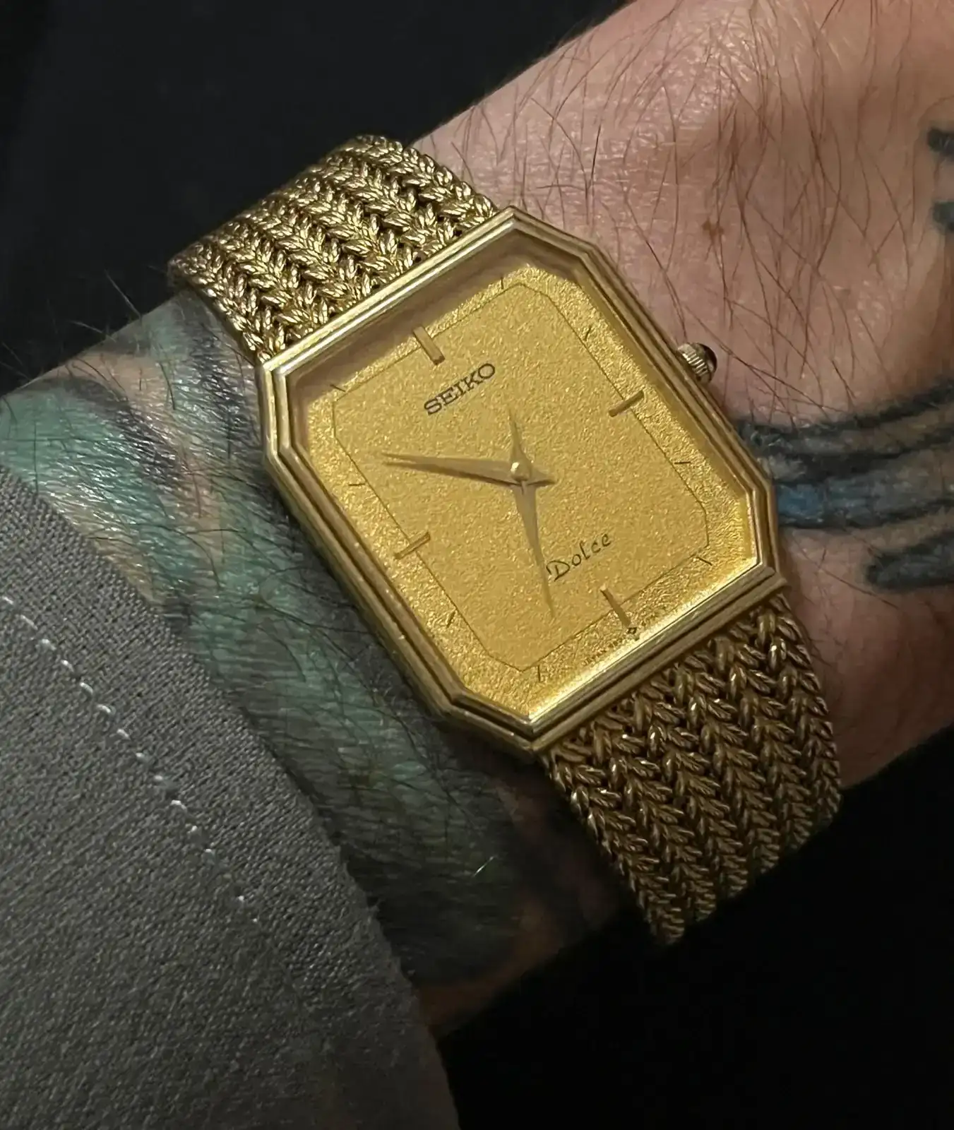 Llevo un largo periodo de tiempo totamente embelesado con los relojes con diseños setenteros, brazaletes integrados de malla, mucho oro, pequeños, cajas no redondas... me parecen el sumo de la elegancia (véanse como ejemplos y en lo más alto el Patek Philippe Ellipse, Rolex King Midas...). Pues bien, obsesionado con conseguir algo parecido pero mucho, mucho, muchísimo más económico he podido conseguir este Seiko Dolce (lo que no haya fabricado Seiko...) que ha calmado un poco mis ansias, espero que os guste, aunque también entiendo a quién le parezca un poco hortera (a mi me flipa!):
