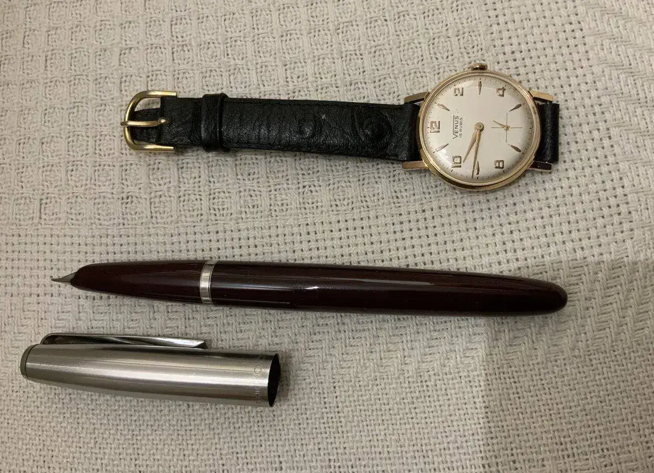 No suelen verse mucho los relojes de comunión de los años 60, supongo que porque gran parte de ellos acabarían en la basura. No eran relojes para ser usados por niños de 6 ó 7 años. Yo conservo el mío porque apenas lo usé, recuerdo que mi padre sólo me dejaba ponérmelo los domingos, debido a la importancia que se le daba a un reloj en aquella época. Yo hice la comunión un año antes, en 1967, y el reloj que me regalaron fue un Venus. Helo aquí con el otro regalo estrella de las comuniones sesenteras, la estilográfica, en este caso una Inoxcrom 55.