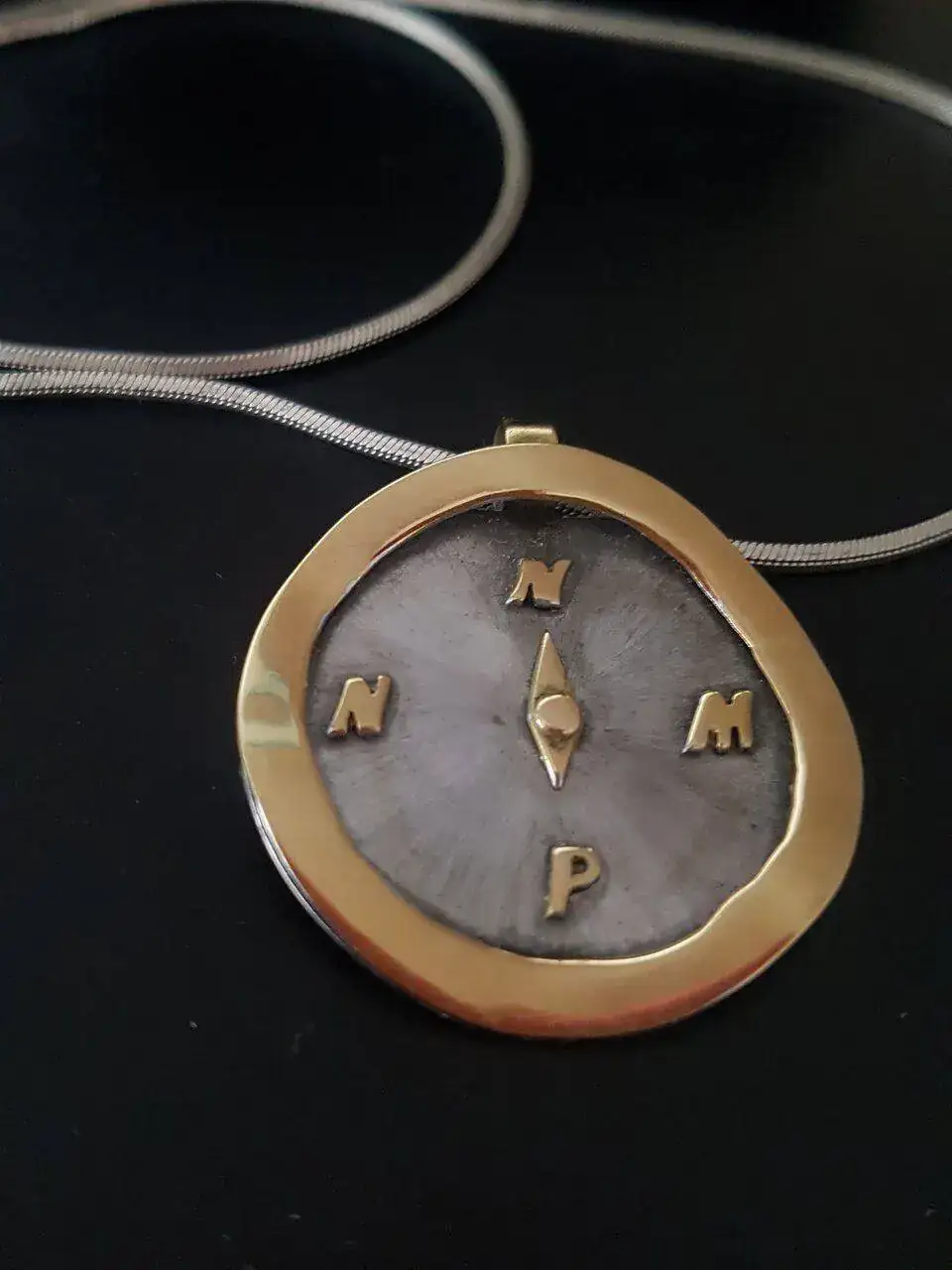 Es un diseño de brújula que hizo mi marido y lo llevó a que me lo hicieran realidad. La explicación es un poco moñas, pero es bonita, y realidad: siempre tengo que buscar mi norte, y mis otros puntos cardinales son mi marido y mis dos hijas (y son sus iniciales). Tiene forma irregular, que aún me gusta más.