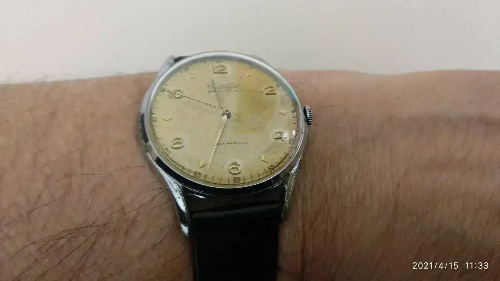 Qué halago que te guste el cuadradito, querido. La verdad es que se conserva fantástico: su caja-diván está estupenda y el cristalote está intacto también: las agujas e índices se mantienen muy bien, y sólo en la esquina superior derecha acusa un pequeño deterioro la esfera. Pero no puedo pedirle más; ya me gustaría a mí llegar a su edad tan bien conservada jajajajaja.Mi querida Abde, pero qué máquina tan preciosa llevas hoy...