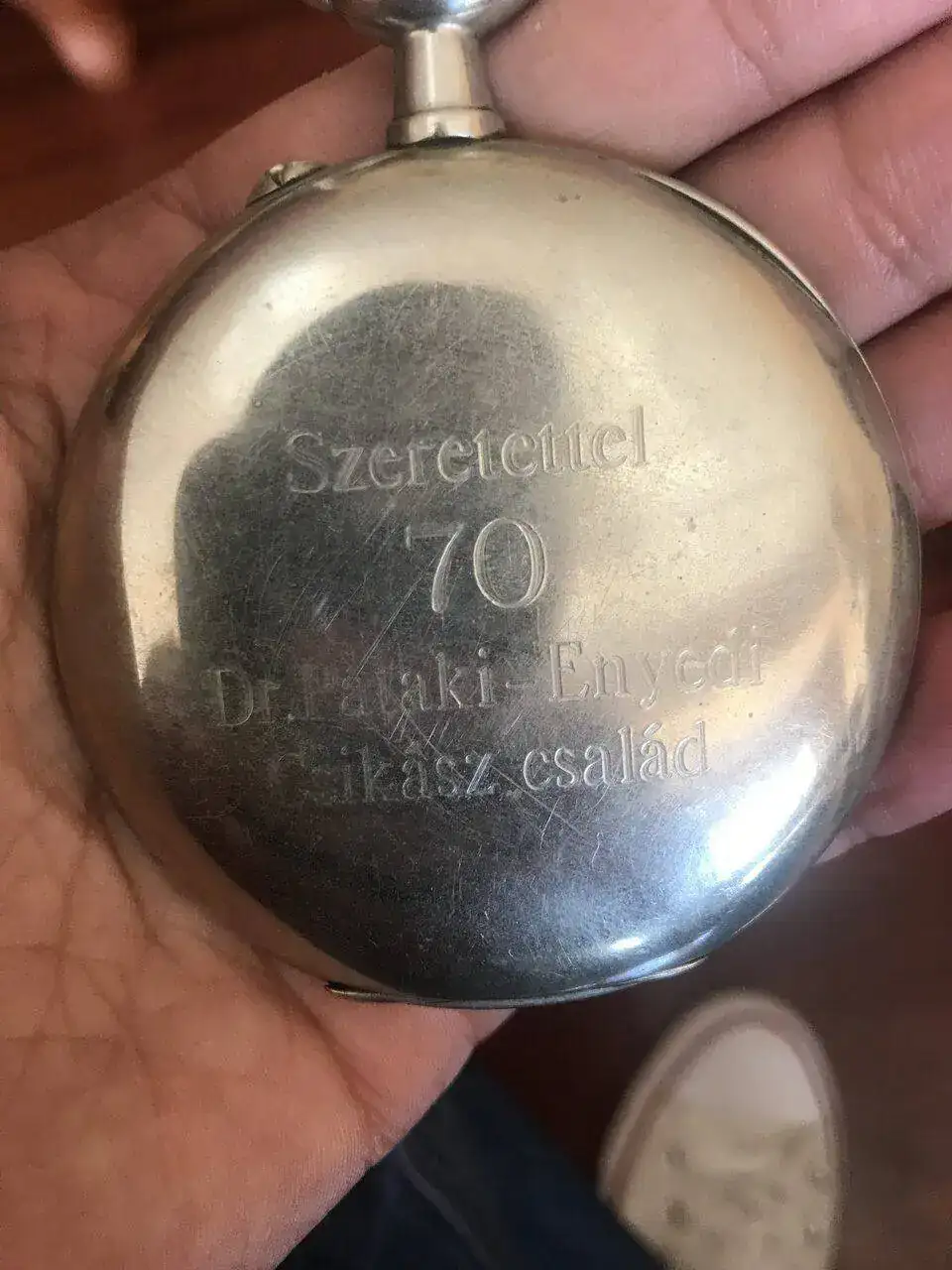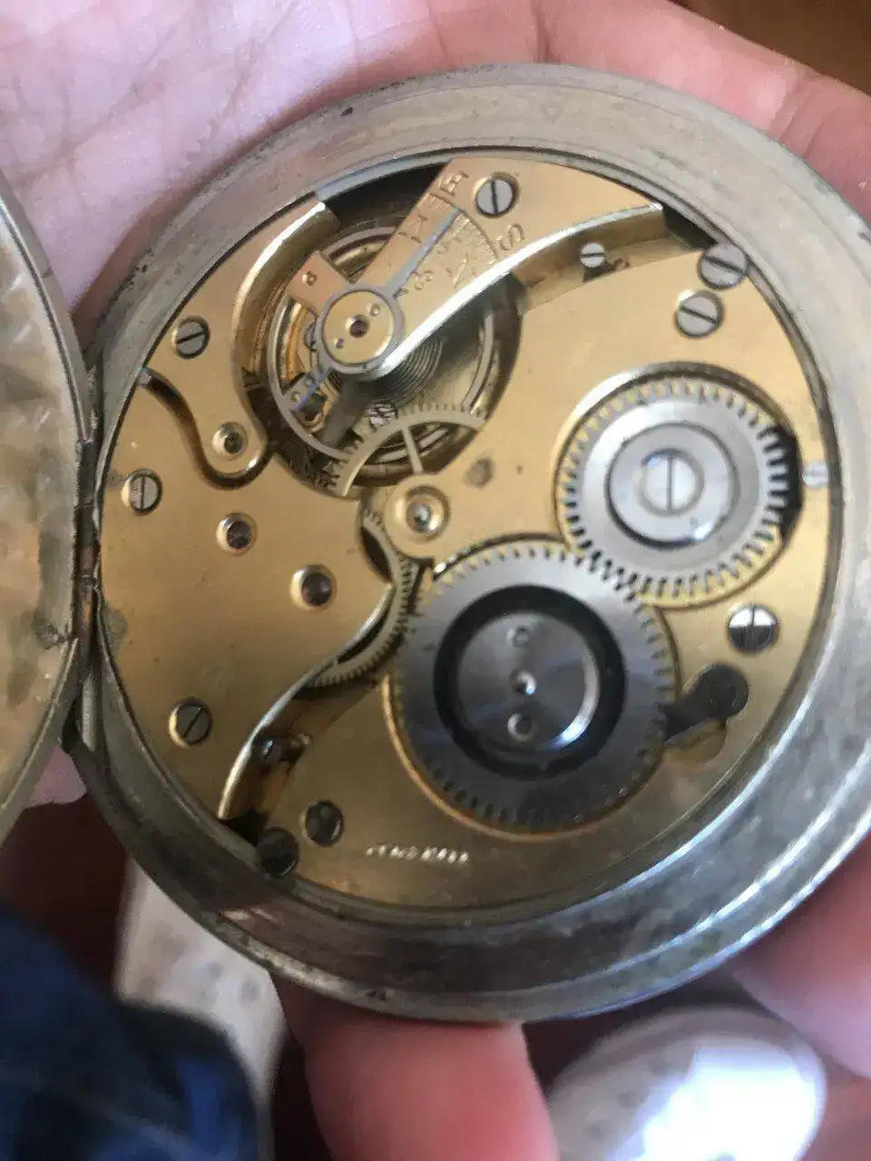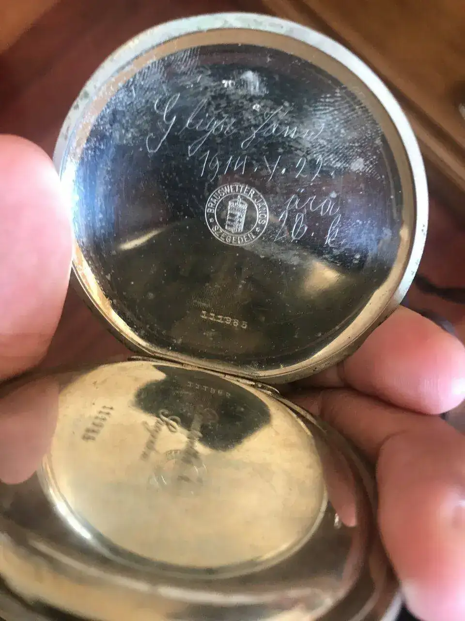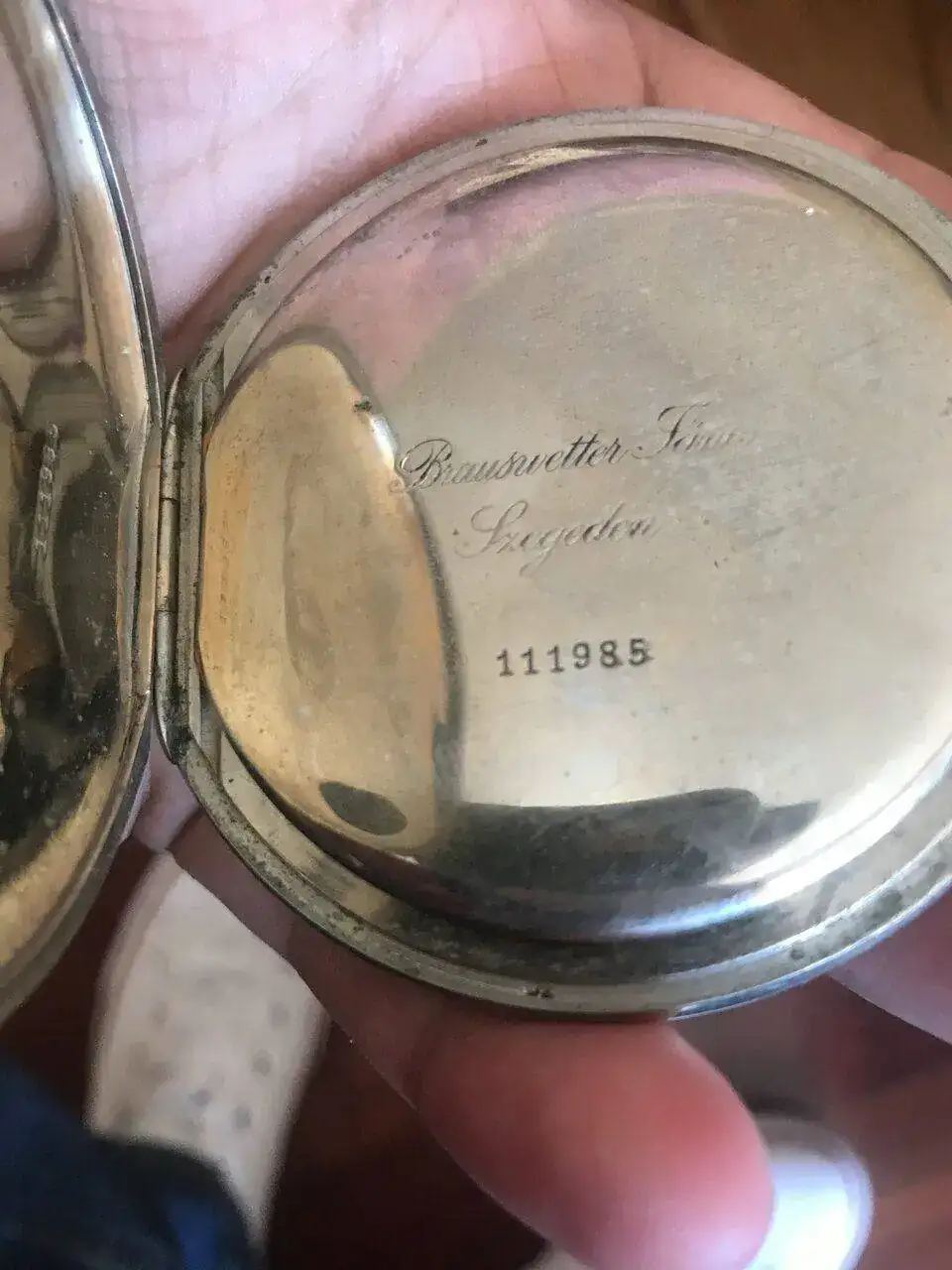 La caja está muy picada y perdió su color dorado hace mucho tiempo. La corona se la cambiaron y pusieron una más grande (seguramente a petición de su anterior sueño, es muy fácil dar cuerda con ese tamaño).