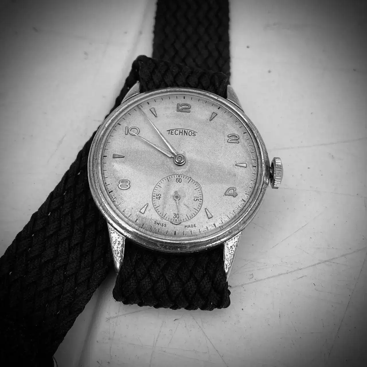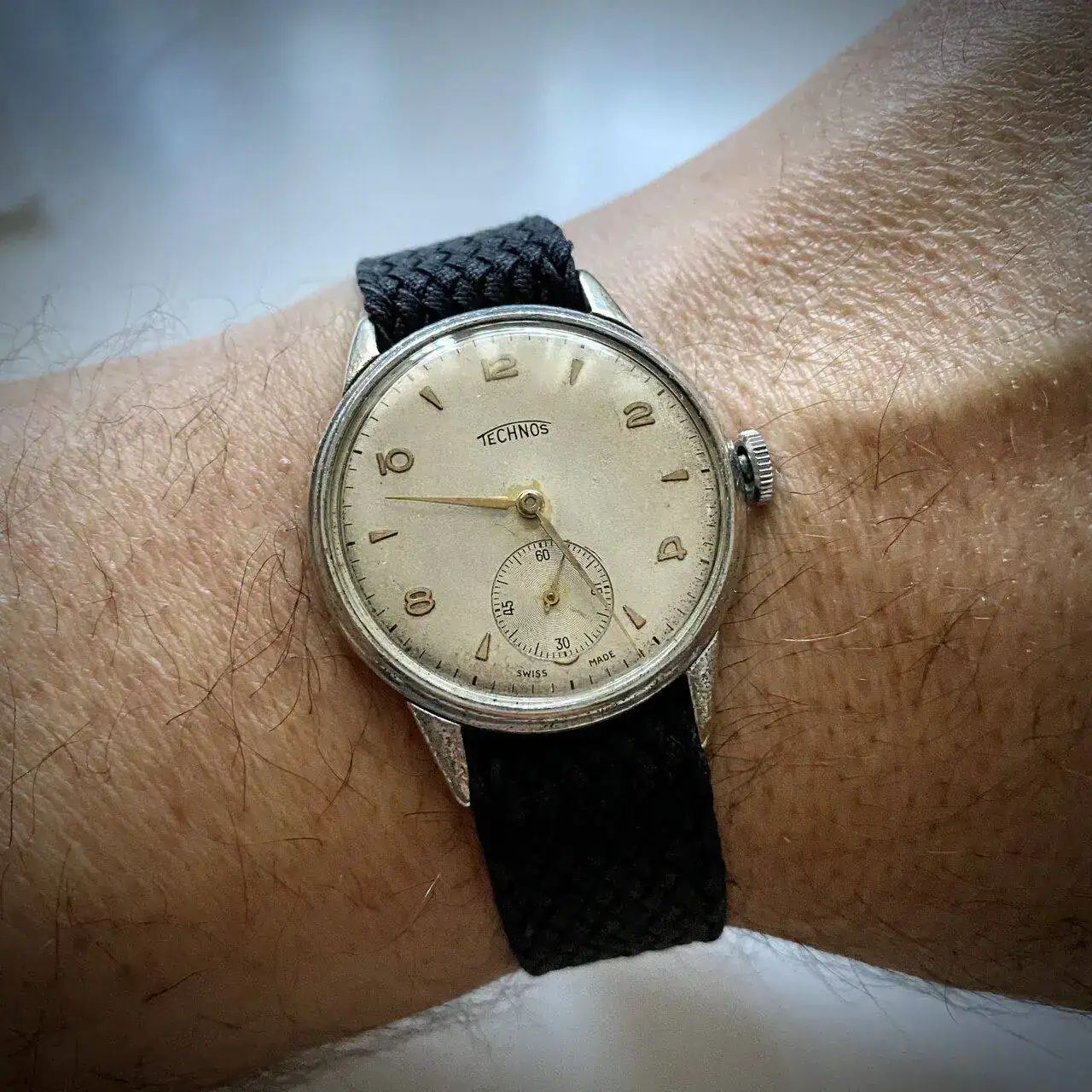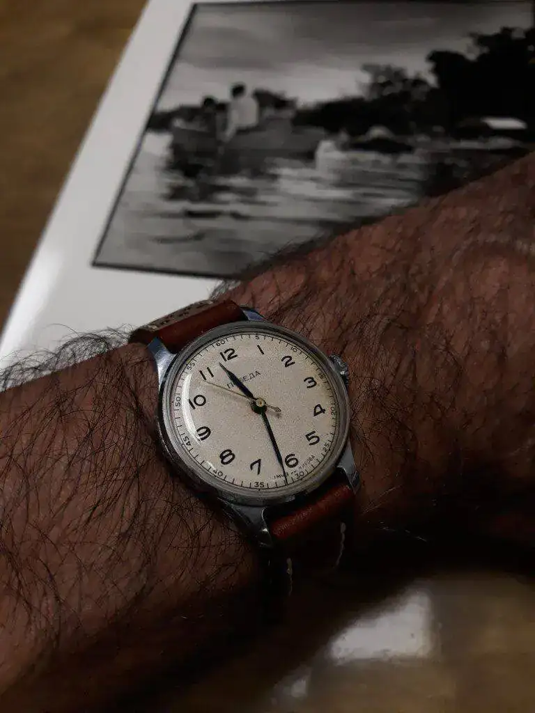 Aprovecho para dejar una foto de mi pequeño Technos. No he podido saber su fecha de fabricación pero por las inscripciones de la tapa será de finales de los 40 o principios de los 50. Más o menos unos 70 años y funcionando.