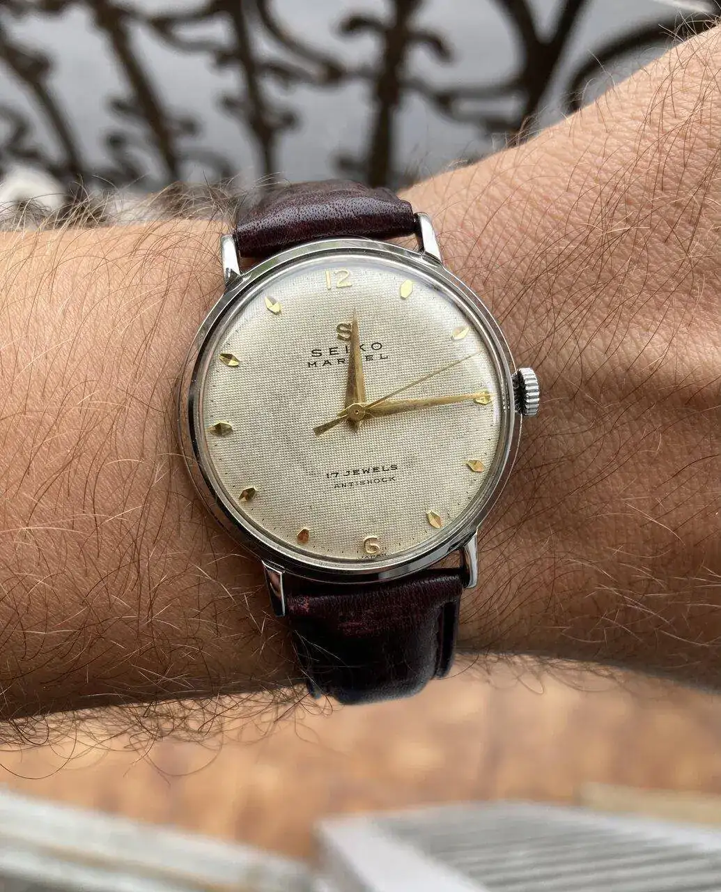 Precioso!!!!! Muy bonito el Marvel!!!! Y esa esfera…. 😍 Enhorabuena, un abrazoAcompaño a las preciosidades mostradas con el último en llegar. Un Seiko Marvel de los 50. El único Seiko que tengo que no es automático. Hacía tiempo que quería uno de estos. No se ven mucho por aquí. Espero que os guste. Saludos a todos.