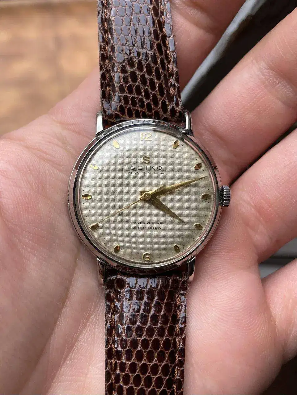 Una joyita, envidia de la sana. Muy, muy, muy, muy bonito!!!. Llevo tiempo buscando un Marvel en condiciones/precio, a ver si suena la flauta😂. Enhorabuena💪🏼Acompaño a las preciosidades mostradas con el último en llegar. Un Seiko Marvel de los 50. El único Seiko que tengo que no es automático. Hacía tiempo que quería uno de estos. No se ven mucho por aquí. Espero que os guste. Saludos a todos.
