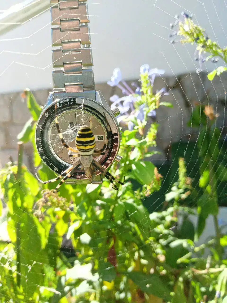 Me permito colgar tres fotos de una araña que ha aparecido en el jardín, por lo que he visto en internet se la conoce como araña cestera por el tipo de telaraña que construye, en este caso se puede apreciar cómo tiene una presa, lo que parece una avispa envuelta. Me he quedado sorprendido por el tamaño, enorme!! El reloj está literalmente a 3-4 mm de la araña para que veáis que pedazo de tamaño.