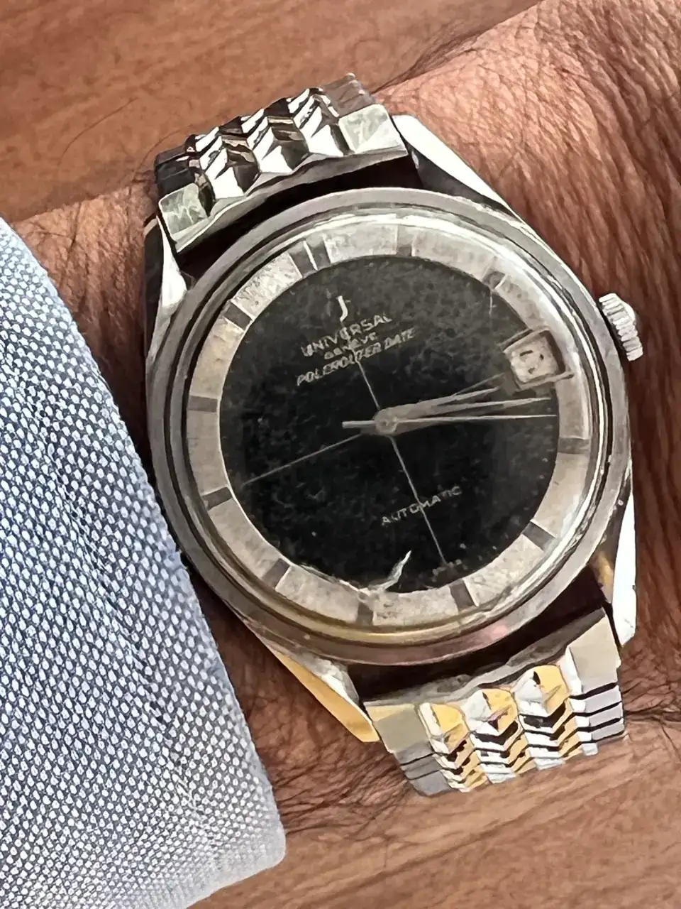 Hoy mi padre me dio su primer reloj. Es un Universal Geneve Polerouter Date año 62 y llevaba 50 años en un cajón sin usar, aún así la segundera a empezado a latir solo cogerlo. Me tocará la ardua tarea de hacerle una buena puesta a punto dado su pésimo estado para así poder darle más vidas de vuelo. Intangibles por docquier.