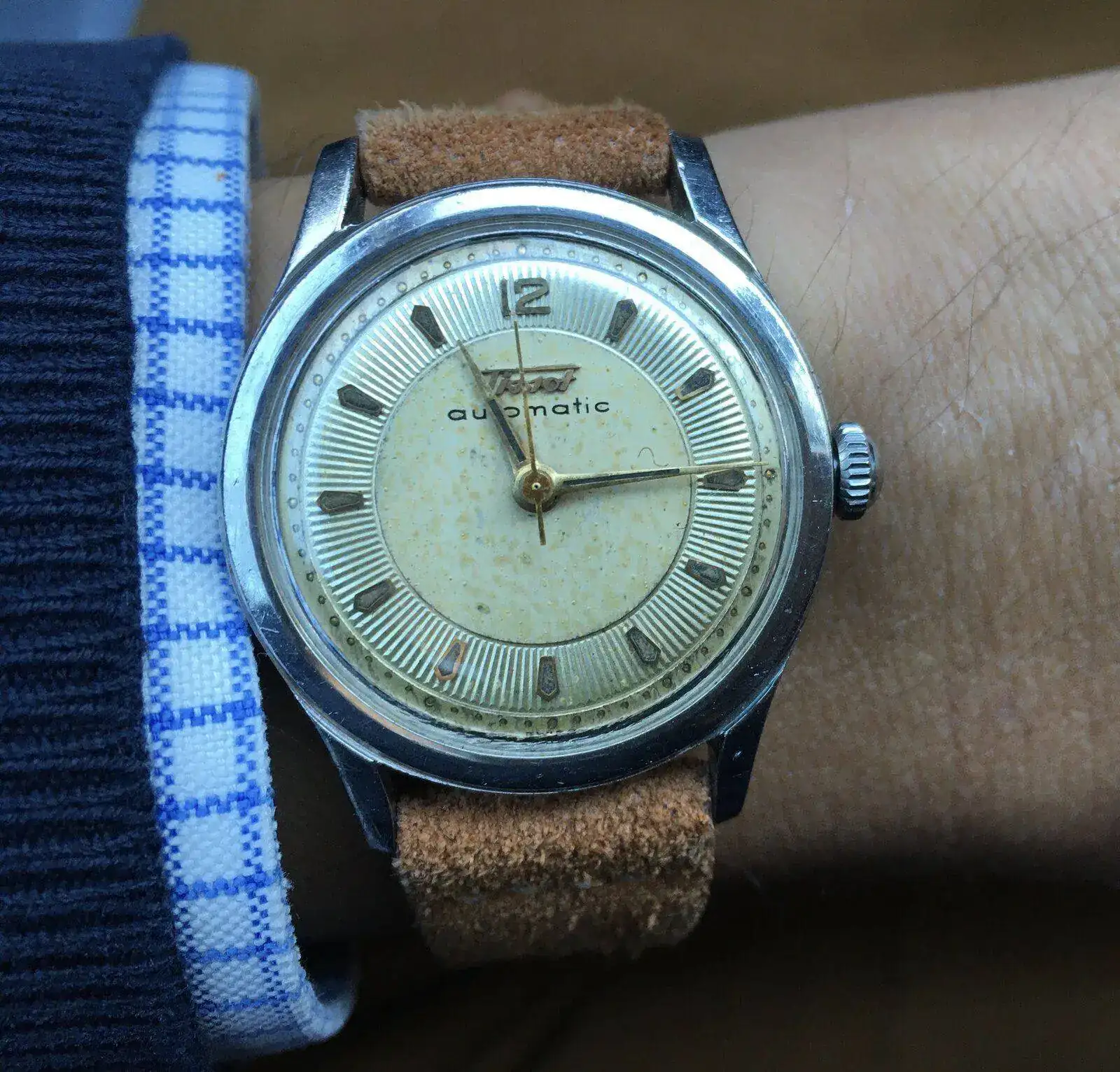 Preciosa foto y pedazo reloj 🤩🤩🤩 qué pátina más bonita.Voy con mi huevo frito jumbo, el cual tengo más claro cada día que lleva radio en sus agujas e índices. Soberbio ese bumper @Zappp