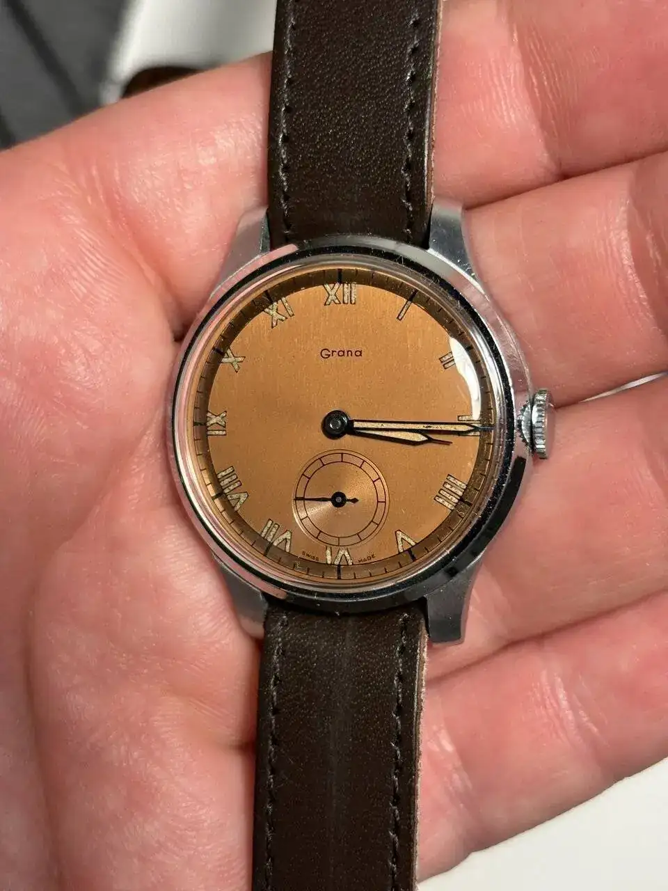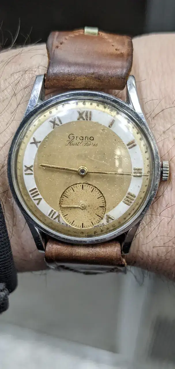 ¡Que chulada de Grana! Y menuda sorpresa de dial con números romanos. Me recuerda al de este Certina que tengo. Incluso la caja tiene un aire, aunque esta no es de acero.Me voy a adjudicar lo de echar el cerrojo al post diario. Tarde, como siempre.