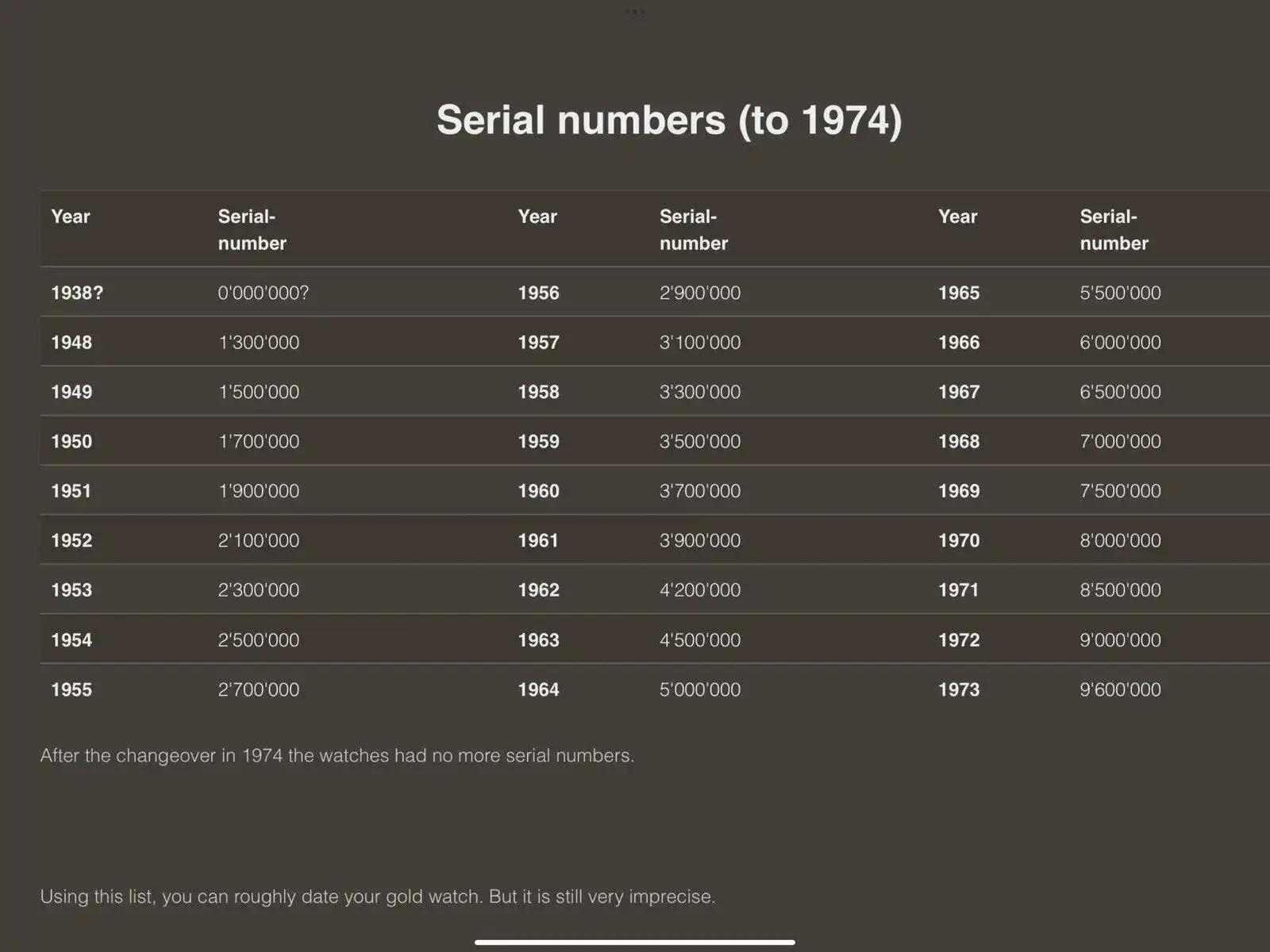 Disculpa, creía que no conocías esta tabla, y efectivamente, tu reloj es posterior a 1973, y a partir de ahí parece que ya es imposible datarlo. En ese texto lo pone, “Después del cambio en 1974, los relojes ya no tuvieron más, números de serie”. Supongo que será un número de control de fabricación, que vaya usted a saber de qué depende.Gracias Kikemorgan por tu contestación. El problema es que esa numeración en millones se debió de acabar como en el 1973. Hasta ese momento fechar el reloj era fácil . Pero los relojes posteriores tienen una numeración en la tapa que es la que no entiendo , ni sé donde donde buscar para enterarme. P.ej.- este 860 3862 22 : Es un sistema de numeración nuevo ? es similar al otro numero que llevaban las tapas viejas ? o ...