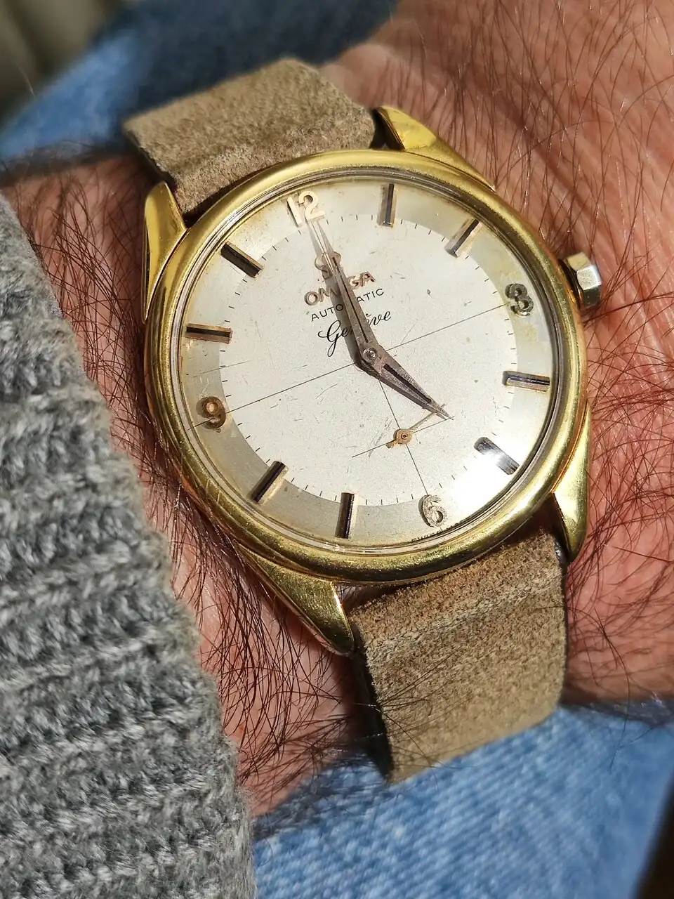 Continuo sin quitarme el omeguita. Difícil de captar el rayado vertical de la esfera y cómo cambia de color según le incide la luz entre un leve plateado y champagne.