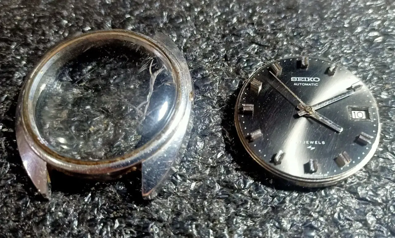Es un Seiko 7005 de octubre de 1971 que no funcionaba por tener la rueda de escape despivotada en un lado del eje.