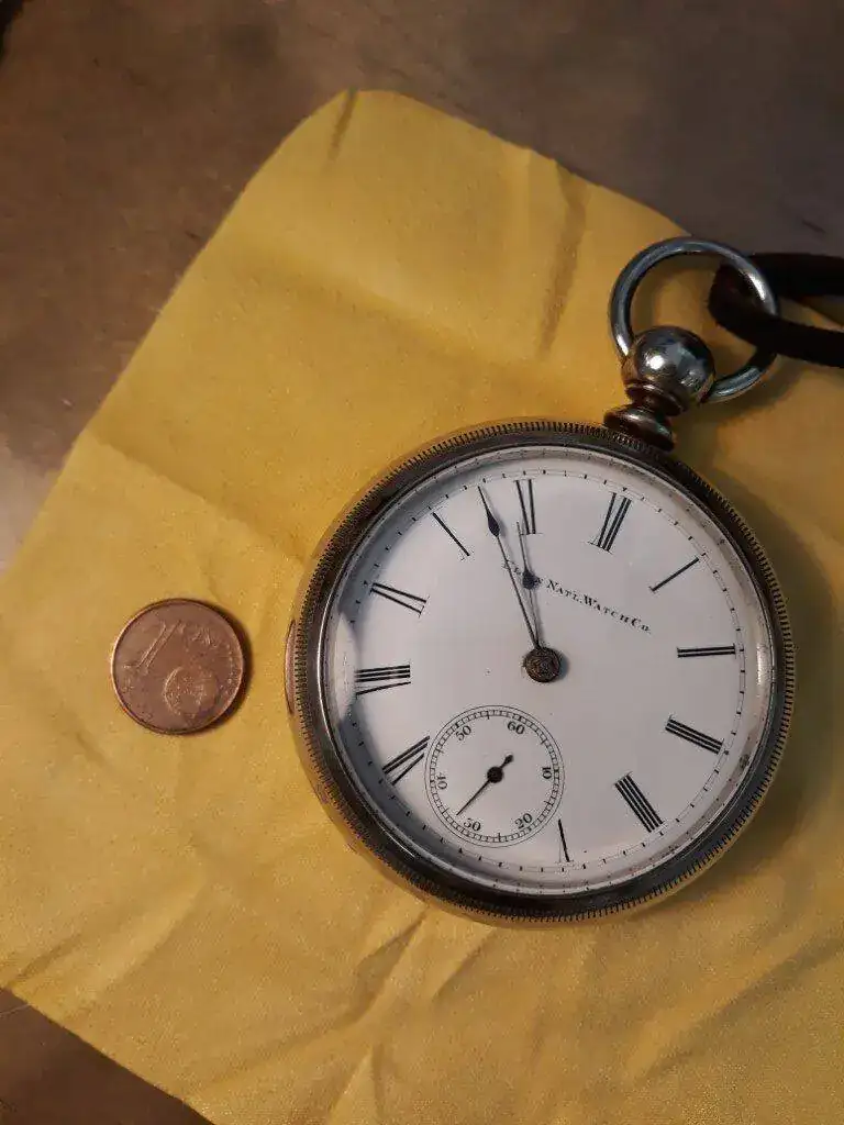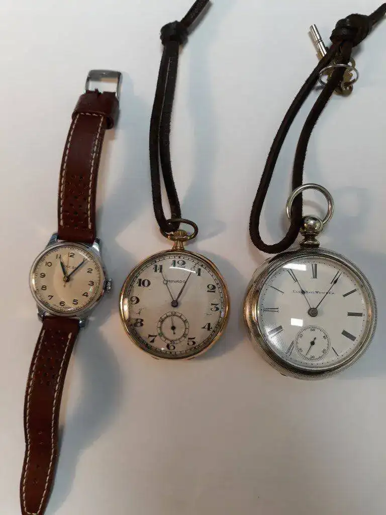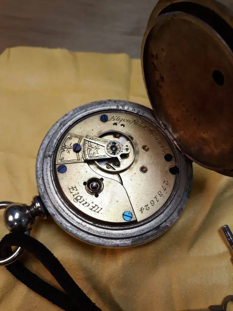 El primero, un Elgin, es una monstruosidad que pesa 120 g. Fabricado en el año 1888, se carga con llave. También el cambio de hora es con llave, distinta a la primera, por algún desgaste. Aquí van las fotos: