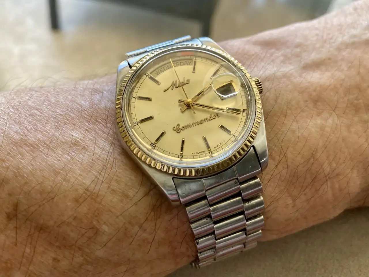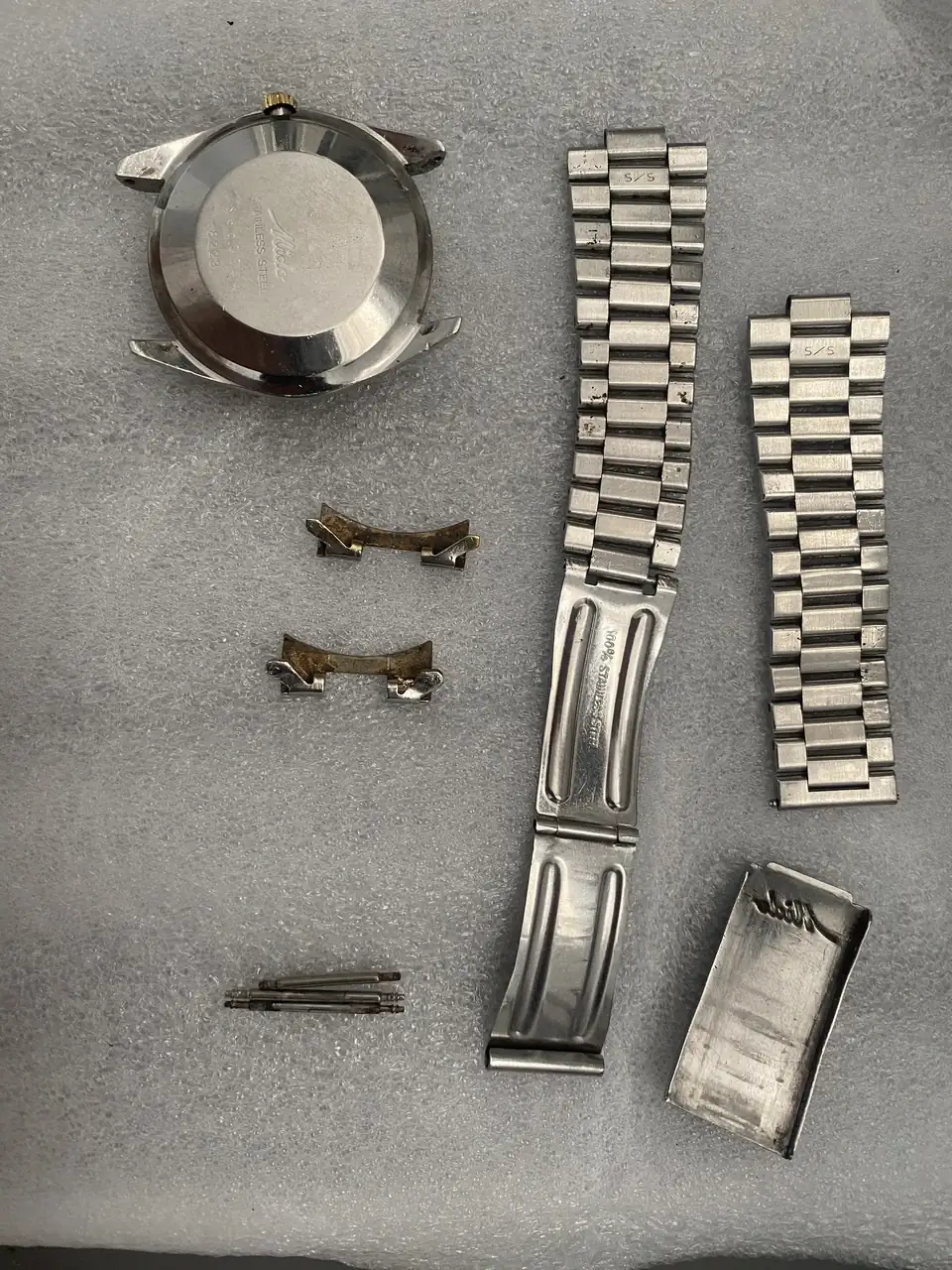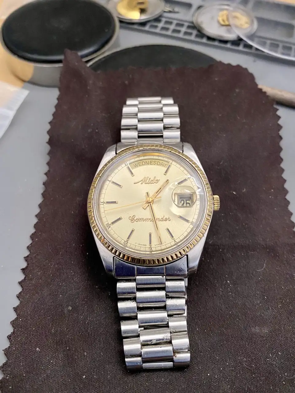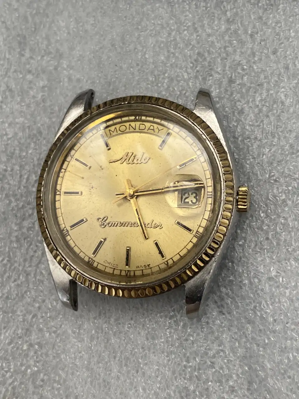 Tenía a este Mido Commander (que tengo dos) aparcado con su preciosa ETA2834-1A (Chronometer) con el plexi desgastado, la caja monobloque sucia, fallos en la marcha por el Etachron y escape, cambio de fecha no exacto y con salto trémulo; una pena.