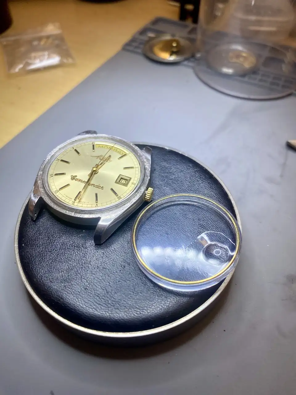 Y tras la restauración, el plexi lleva aún el plástico protector. La marcha excelente, como chronómetro que es; queda sólo comprobar reserva de marcha (de 50 horas).