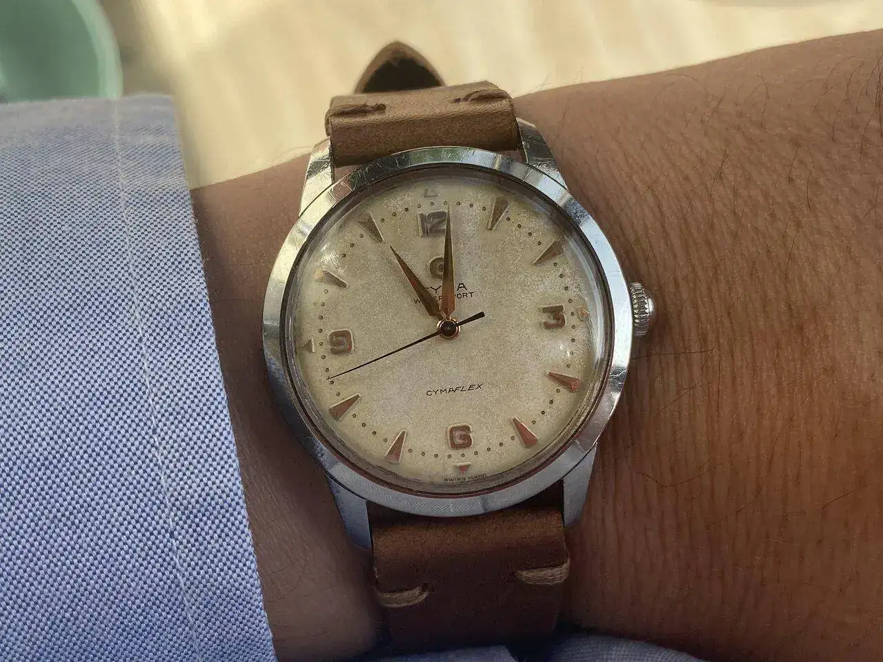 Compré este Pronto-Verdal ( marca Belga), aparte de porque me gustaba, para aprovechar una correa metálica antigua de la marca, ahora creo que le favorece mucho más esta de cuero color miel, hecha en casa con cúter y pegamento que reconozco que no fue a la basura de milagro.