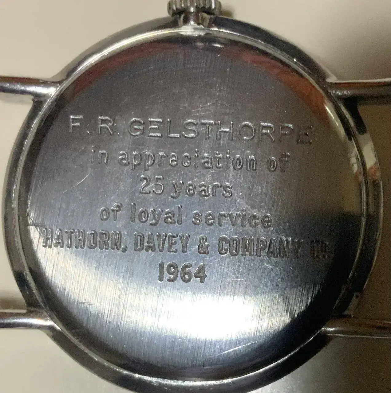 Pues esta inscripción me da mucha información, que es un reloj de procedencia británica, concretamente de la ciudad de Leeds, que es de 1964, que su primer propietario fue Mr. Gelsthorpe, que empezó a trabajar en la empresa en 1939, lo que me hace intuir que debió nacer alrededor de 1920, y que la compañía donde desempeñaba su actividad laboral, se dedicaba a la fabricación de maquinaria de bombeo.