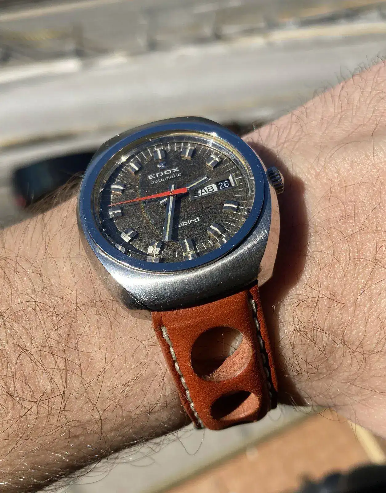 A mí me parece que la racing le va que ni pintada a este reloj, Denbora. Aparte, me gusta especialmente cómo ha envejecido ese dial, y la foto del arcoíris inmaterial sobre esa esfera tan material, poesía pura.