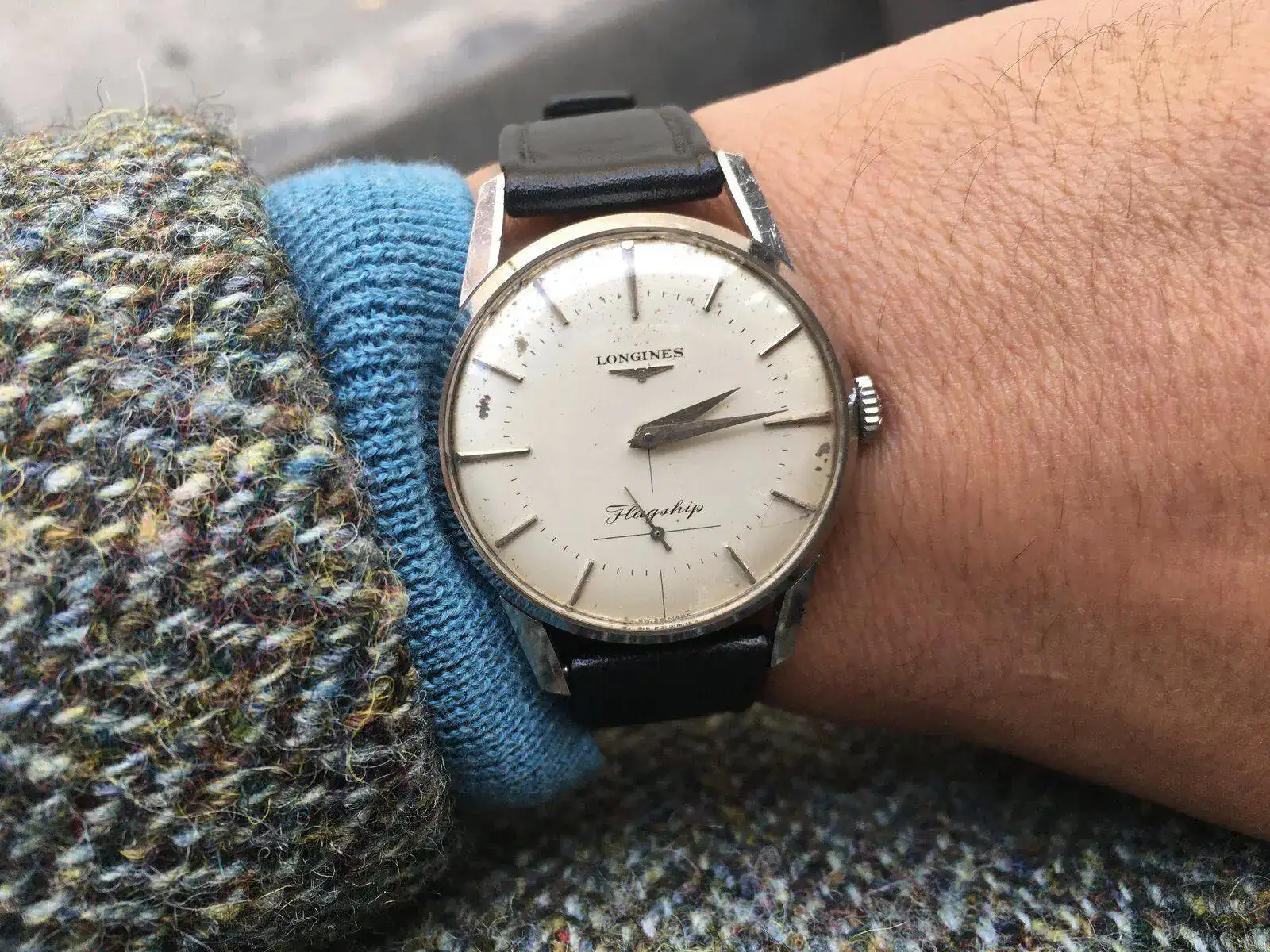 He tratado, sin éxito, de convencer al dueño del Longines yanqui de que le quedaba pequeño, pero lo estrenaba hoy y no he tenido éxito. En lo que espero que me haga caso es en lo de no retocar la esfera 🙏