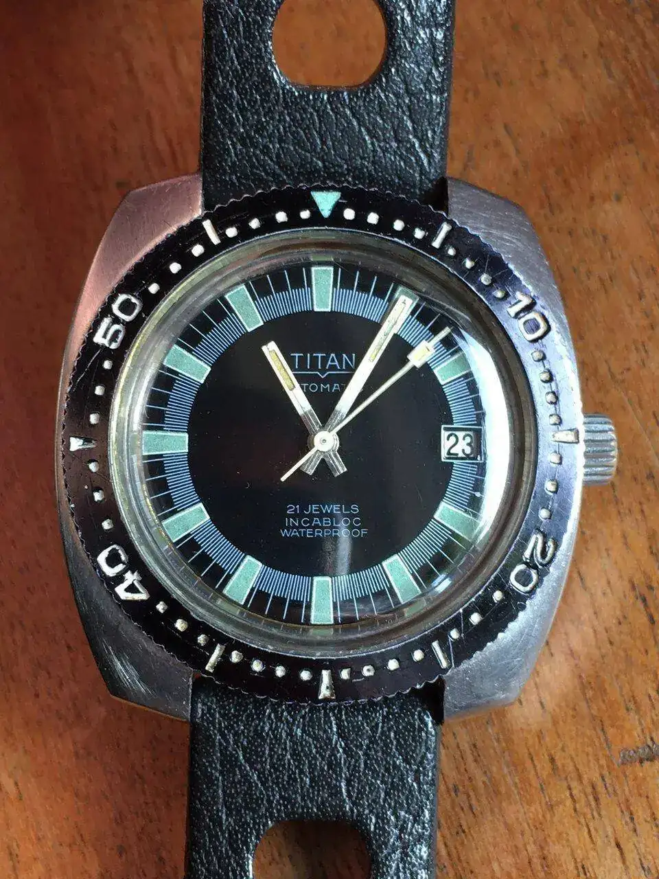 El triángulo verde del bisel que adapté a este Titan, era verde oscuro y lo he cambiado al color verde de los indices, y además luce ¡¡