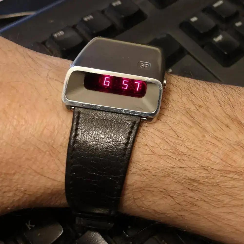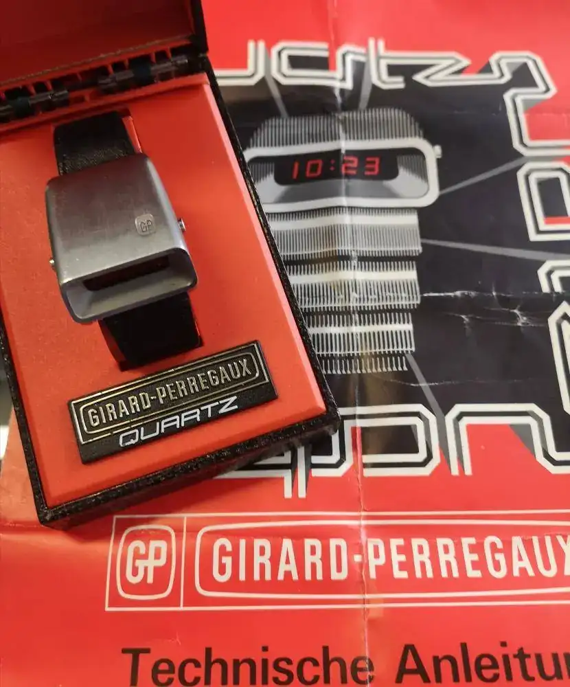 Después de muchos años con él en la mente, por fín me decidí y hace unos días me llegó este Girard Perregaux casquette. Un reloj con un diseño que me parece espectacular, acorde con los gustos de su época, y la gracia de los LED que tan poco tiempo estuvieron en el mercado. Es una pena que no trajera su armis y sí una correa que ni siquiera es de la medida correcta. Ya estoy encargando una, pues lo irregular de su caja impide ponerle una normal, en un lado mide 25 y en el otro 22.