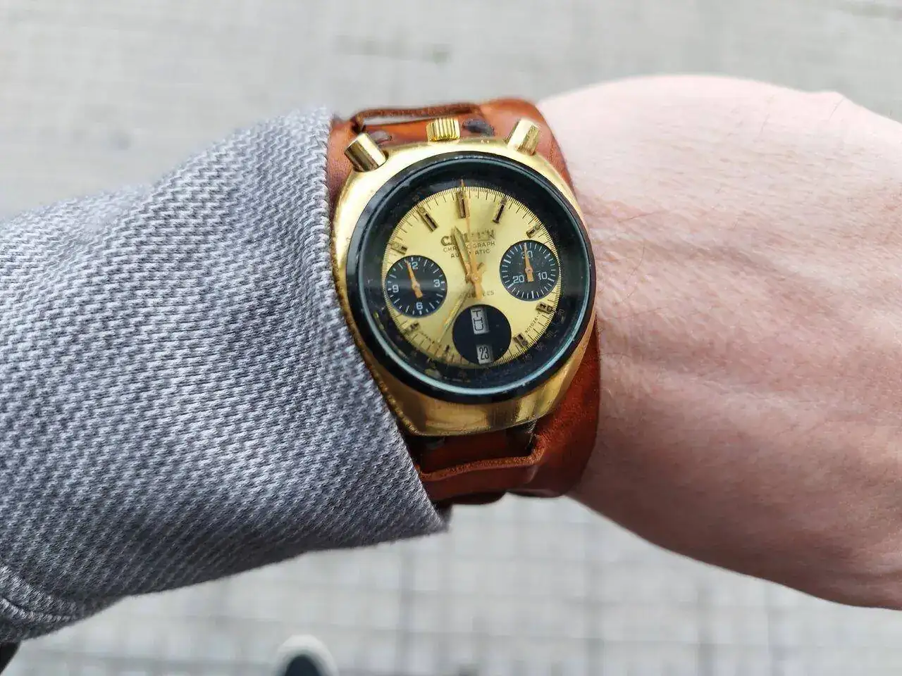 Gracias @pinon . Me lo pongo mucho en verano, pues mola con manga corta. Aunque el chapado tiene ...digamos "sus limitaciones" y en contacto con la piel se daña algo. La bund la hice yo, pero tengo que mejorarla algo.Jo, yo cuando veo esa peli también me dan ganas de ponerle una bund a mi Citizen y "parecerme" al Brad Pitt ese![]()