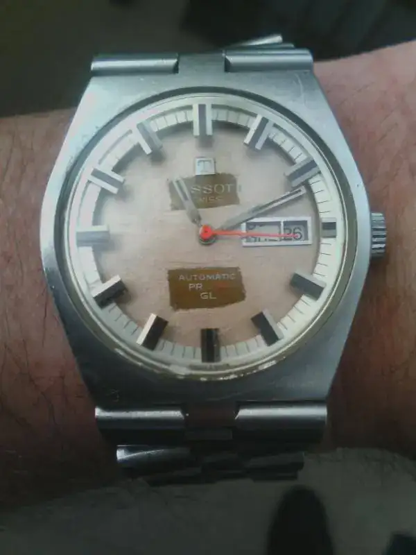 Parece recubierto de mascarilla facial o plastilina... ya puestos casi igualarlo todo y dejar sólo el logo aplicado, pienso yo. La huida hacia delante o el Cillit Bang.........Hoy toca Tissot con esfera retocada por obligación, .............. Lo del día de la semana es así, pues cambia cada 12 horas, llevando el disco con los días duplicados.