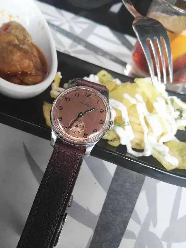 Es el segundo vintage que adquirí después de un Omega. Le tengo muchísimo cariño y no sé por qué, siempre que lo miro me lo imagino en la muñeca de un explorador de época, aunque sea un poco anacronismo. De ahí la foto con el mini fósil del pececito [emoji18]