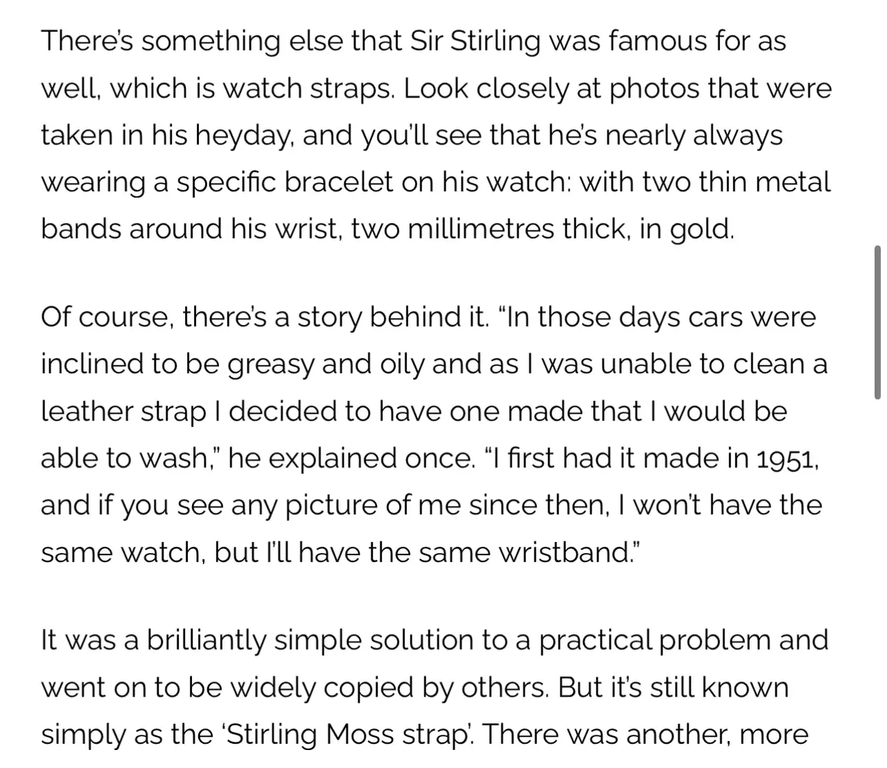 En el mundo del motor y en general se le suele llamar “Stirling Moss strap” ya que, según los datos, fue este inolvidable piloto el que lo ideó en 1951 para evitar la acumulación de aceites y sudor bajo las habituales pieles de la época:
