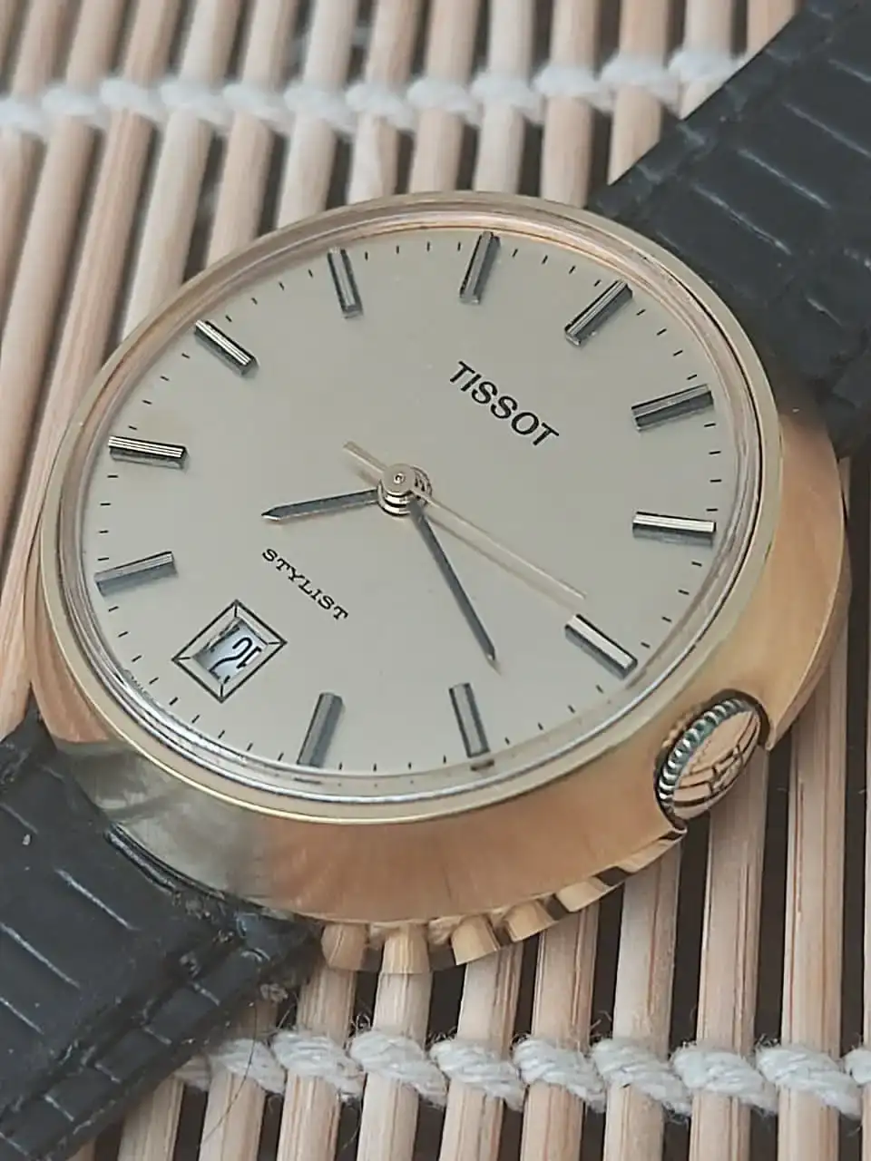 Ayyyyy sí qué hermoso es este Estiloso Tissot, querido mío. Muchos detalles en él me encantan: la caja, con su gran presencia, la corona escamoteada y los vistosos perfiles y acabados, la esfera tan limpia y ordenada con el fechador a las 6, los índices... Tiene toda la esencia setentera y a la vez gran elegancia