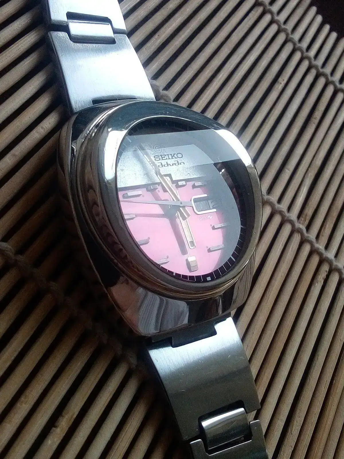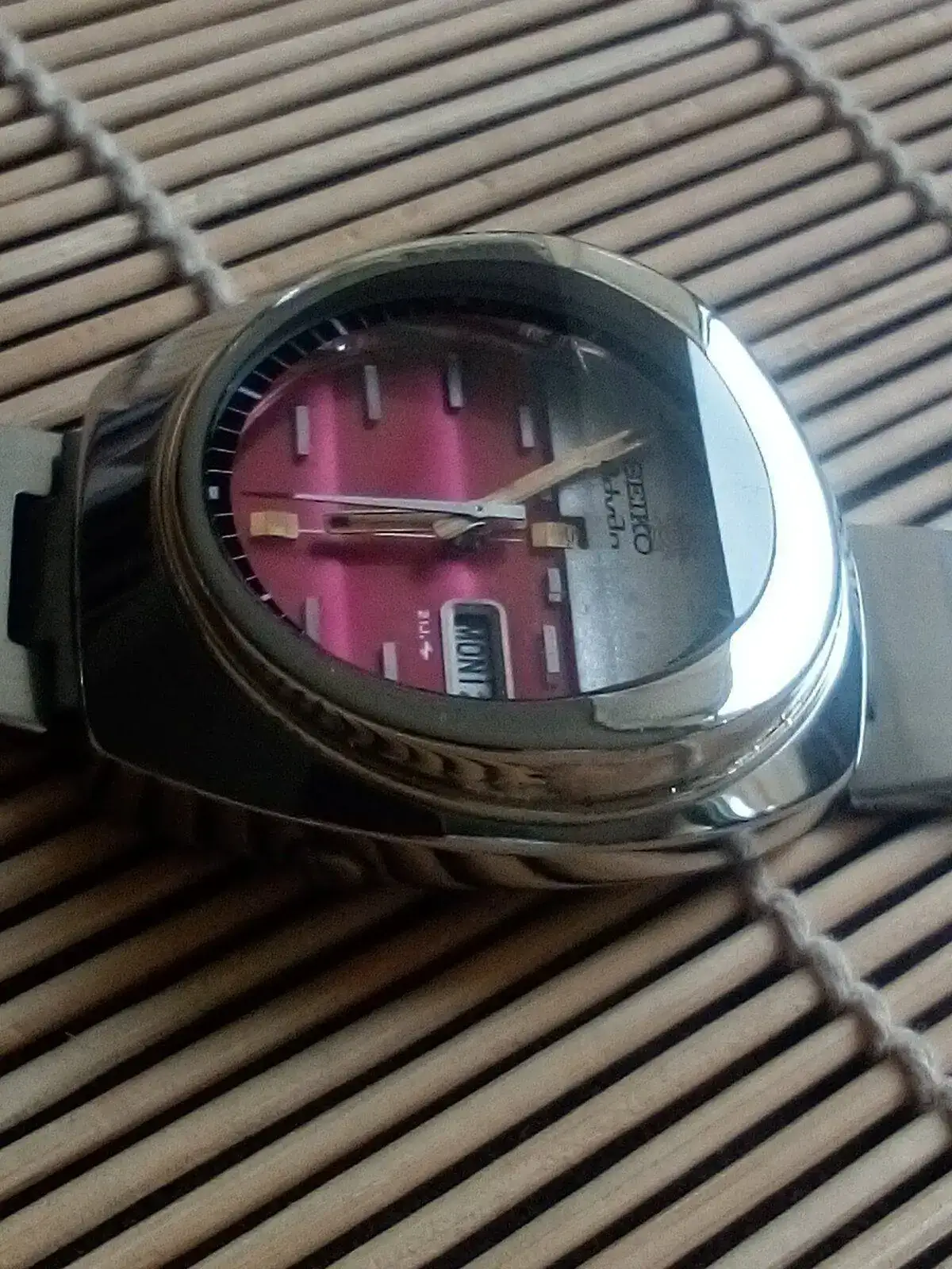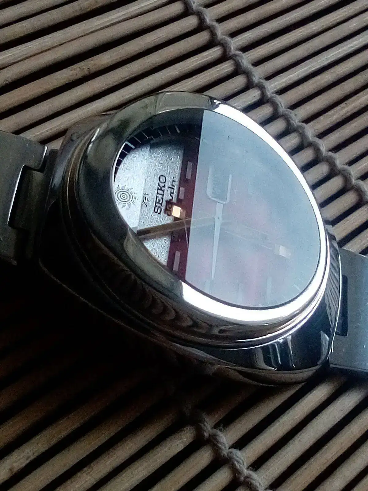 Está llenito de detalles de lo más atractivos que voy apreciando gracias a tus magníficas fotos. Hoy, por ejemplo, he reparado en cómo se reflejan, según el ángulo, las diferentes partes de la grafía en la parte biselada del índice de las 12, en los bonitos irisados que hace la esfera en su parte superior de la "nata", y en el rayado de las agujas, que al distorsionarse por efecto del biselado cristal en la minutera parece hacer una pequeña chicane jajajajaja. Una fuente inagotable de detalles esa preciosidad