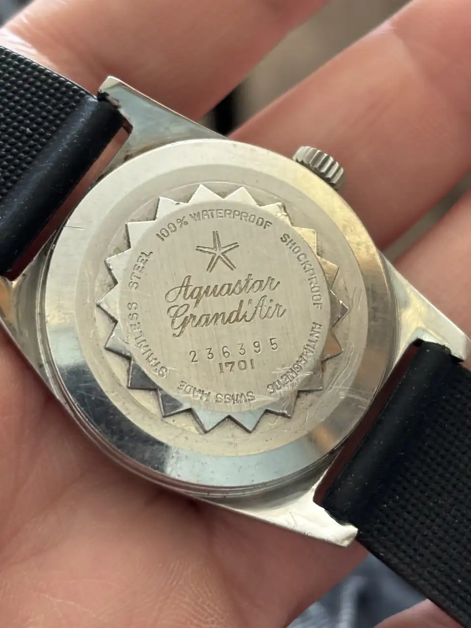 Que bien! Lo pone.Es original seguro. Magnífico Aquastar. Es curioso que no vaya marcado en la esfera como Grand Air. En la trasera lo pone?. Supongo que será por las historias y malos rollos entre Duward y Aquastar.
