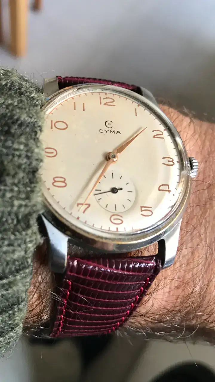Esa correa nació para ese reloj.Así le queda de bien esta correa de piel de lagarto, color Burdeos al CYMA cal. 230. Ver el archivos adjunto 2952210