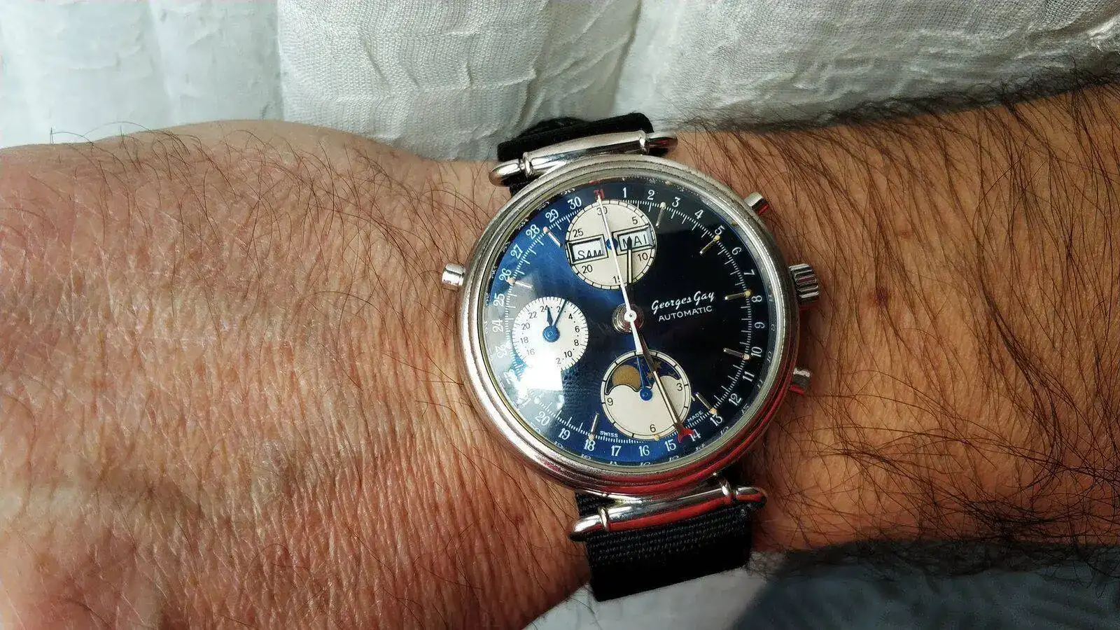Hoy muestro el reloj más complicado que ha pasado por mis manos. Si no lo digo mal, es un cronografotriplecalendariofaselunarautomaticoparadadesegundero. Eta 7751