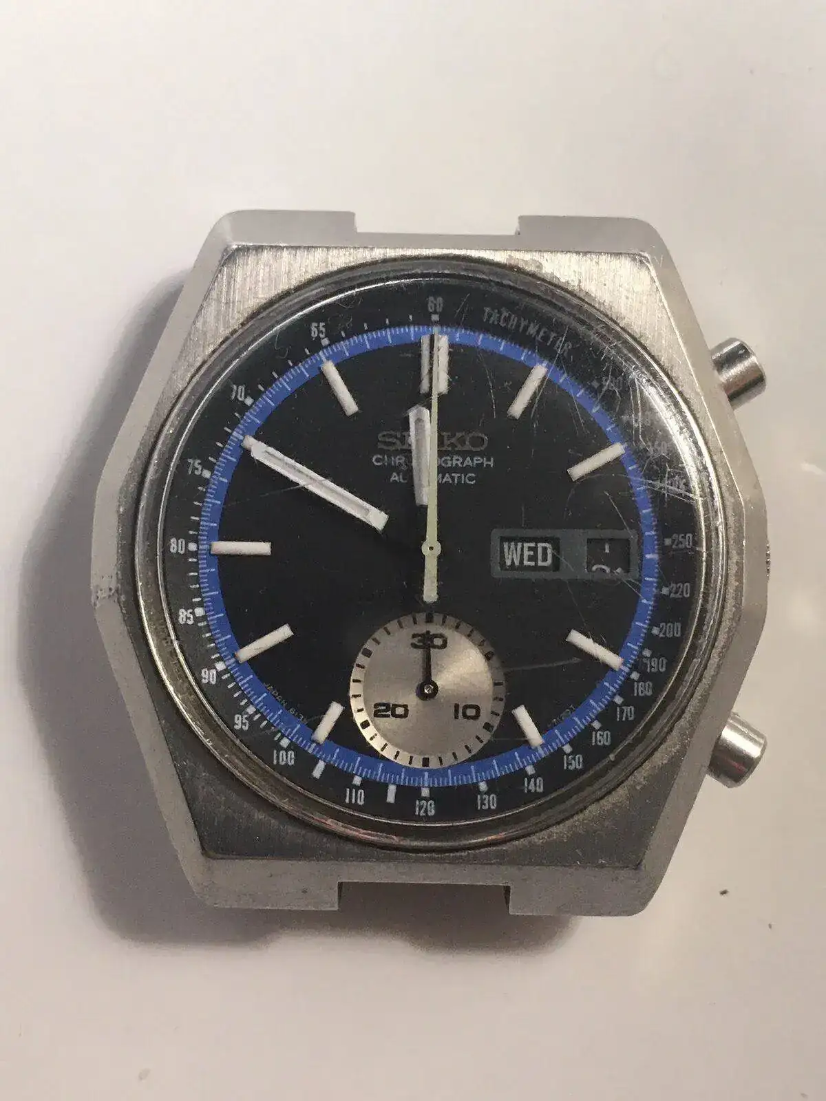 Entiendo que el reloj se halla en su forma original, siendo un dato importante el color negro del día del mes, que creo que es propio de este mecanismo automático, y lo diferencia del mecanismo de cuerda manual. Lo comento porque he visto en ebay algunos modelos, pero con los días de la semana y mes en color blanco. Le queda muy bien cuando la luz le da al reloj, un color entre azul y negro.