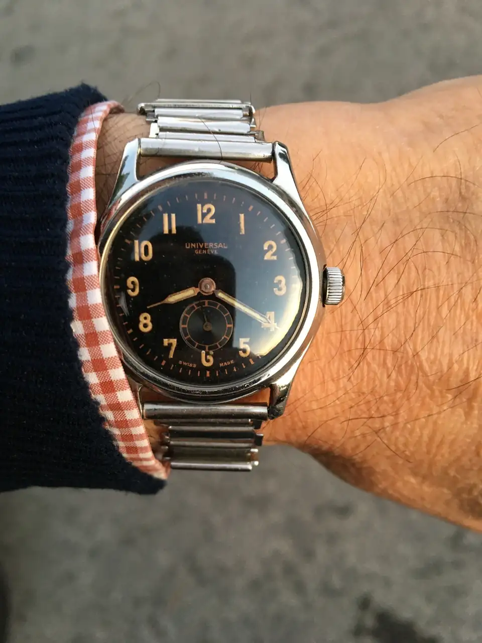 Yo coincido con Mazel en marca y con Pinon en, al menos, estética militar. Os presento un UG raro, muy raro, es un bumper (el único que tengo), pero no lleva el consabido calibre 138/139 ... no he sido capaz de identificar el movimiento ... y os pido ayuda (Manolo ya me hizo ver la necesidad de sustituir la tija, pero la foto es de la red, el mío está impoluto). Además, si os fijáis, en la esfera tampoco hay mención a que es un reloj automático (y os aseguro que es original)