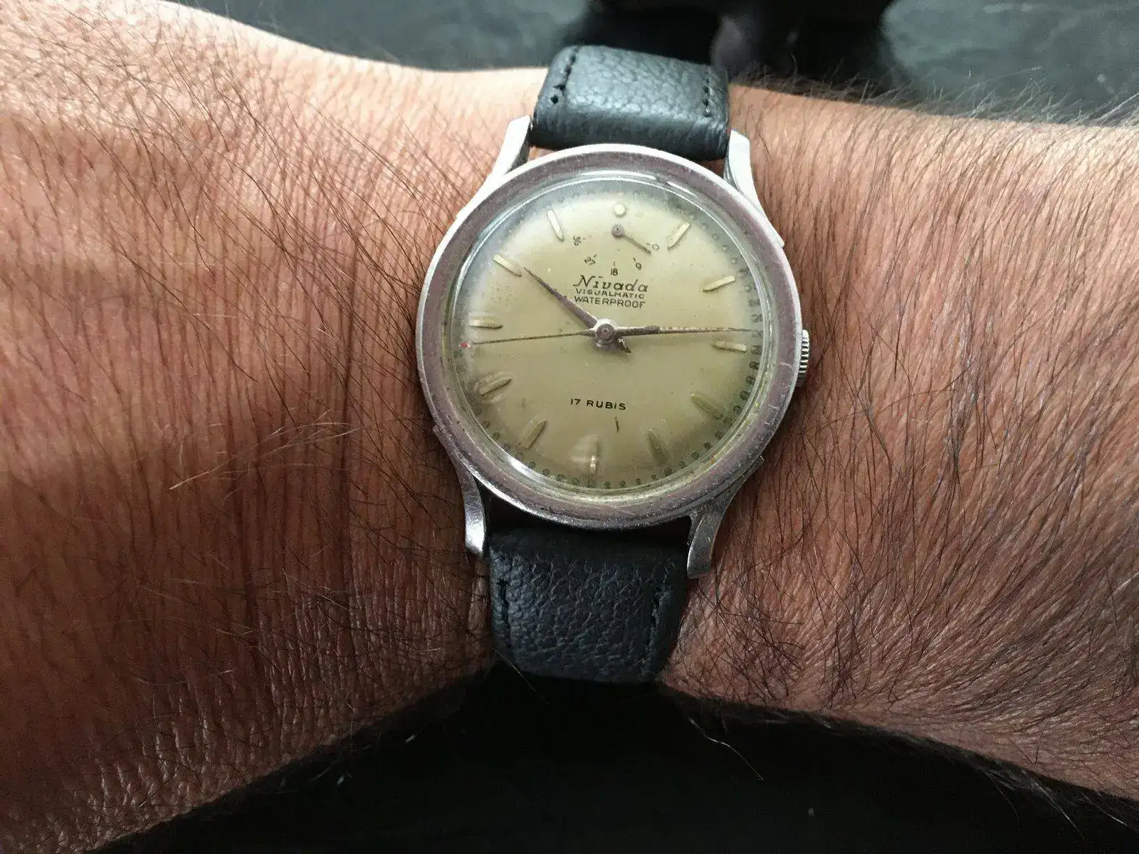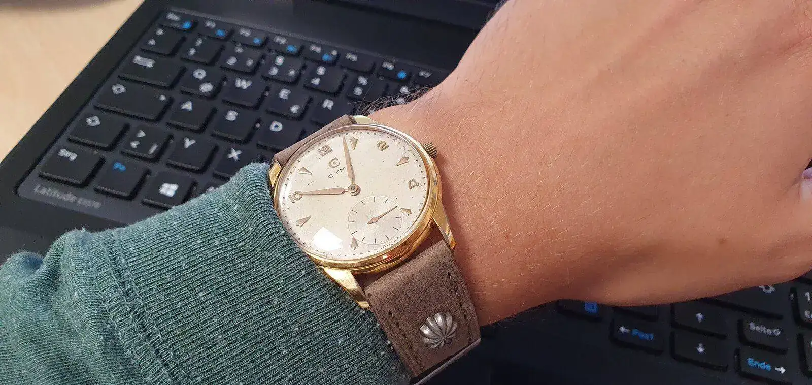 Ummm...no me convence.De vuelta en casa. Menuda diferencia de temperaturas. Voy con mi 586, sin K pero con nueva correa. No estoy seguro de si le pega del todo. La cogí específicamente para este reloj, pero la hebilla y el grosor en general quizás me parece too much para un vintage. Vosotros que opináis?