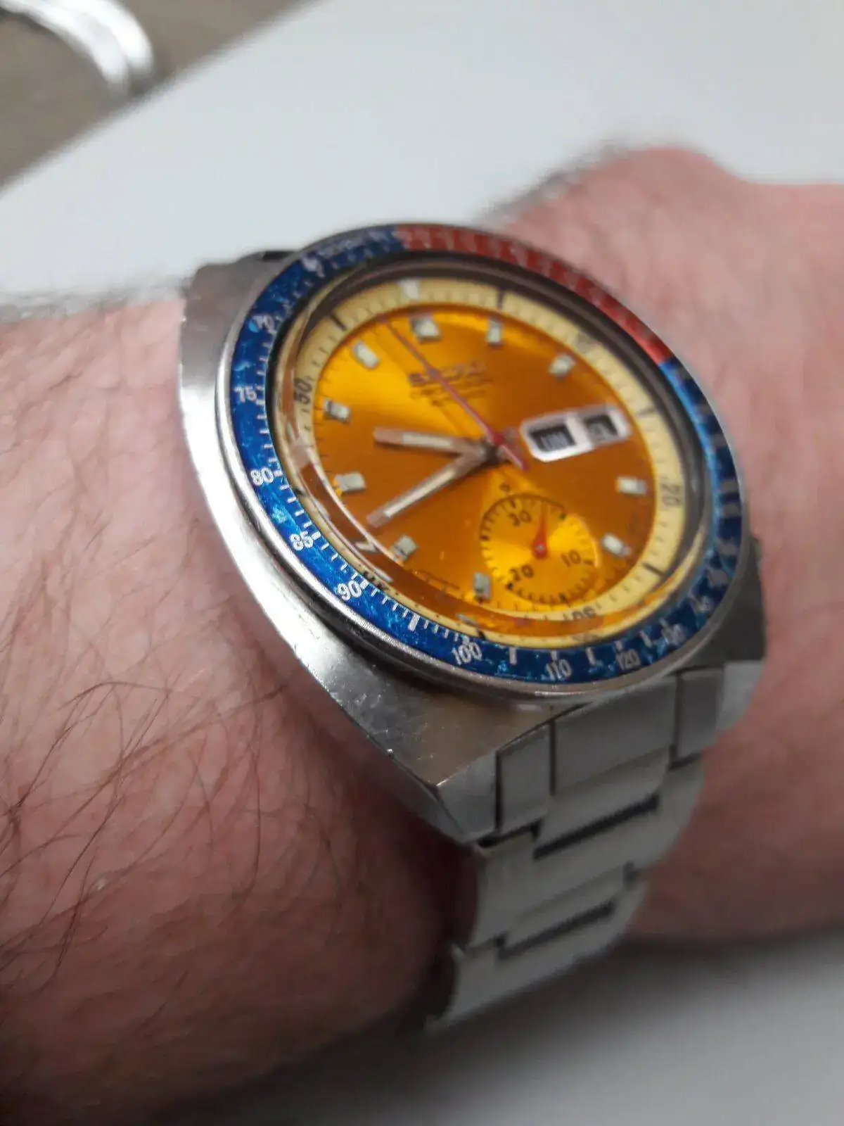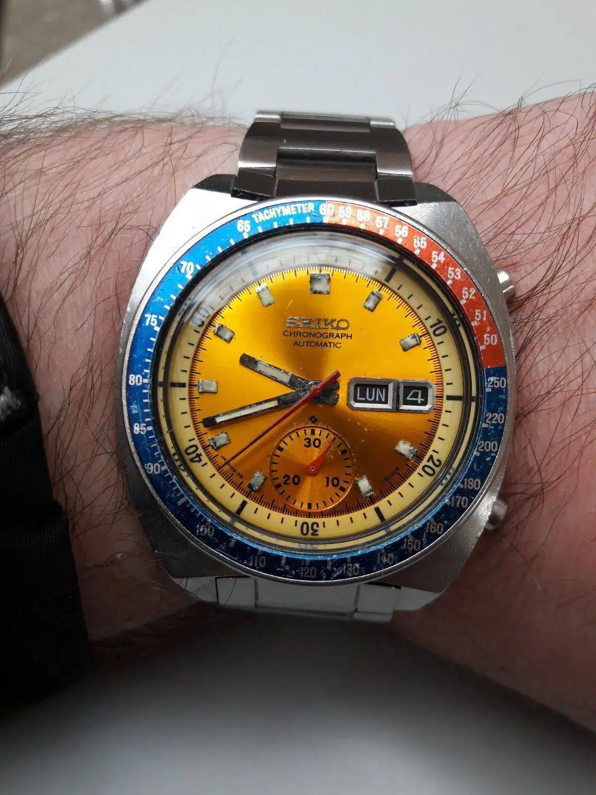 Ese es nuevo, bribón. Ese no te lo conocía, y con todo original, sí señor. Esos ya casi no se encuentran. Enhorabuena amigo.Buenas tardes distinguida concurrencia vintagera. Hoy con un seiko crono setentero con mucha historia detras. Seiko 6139-6002, un Pogue como dios manda.