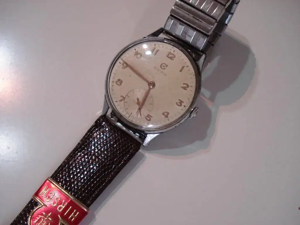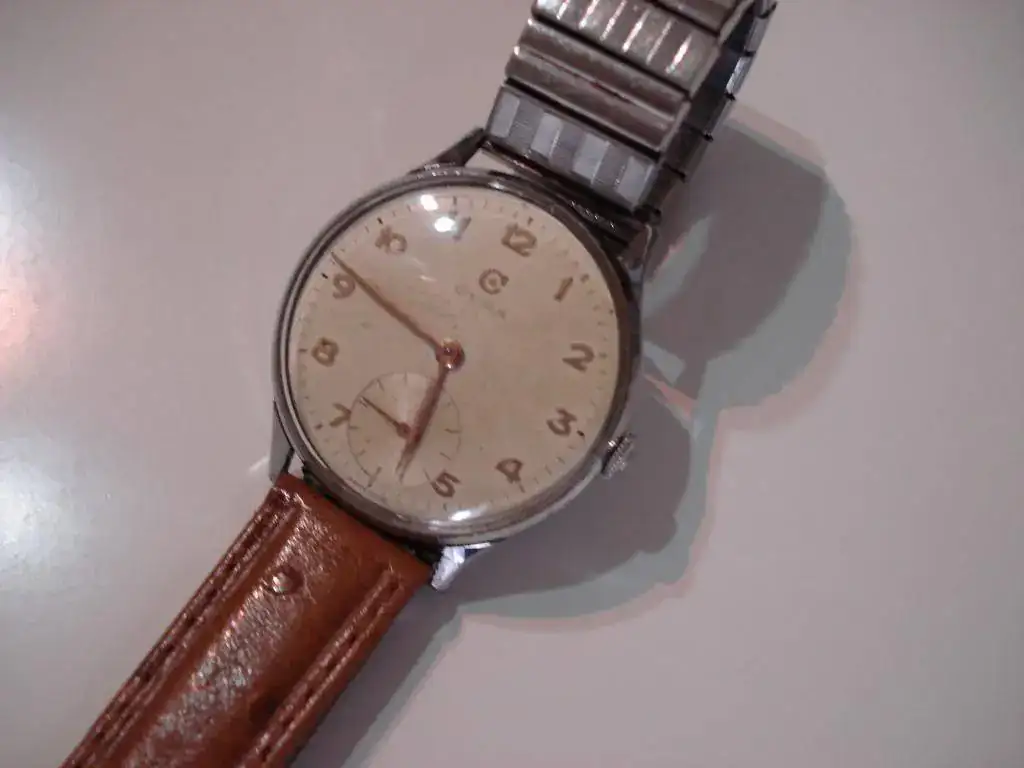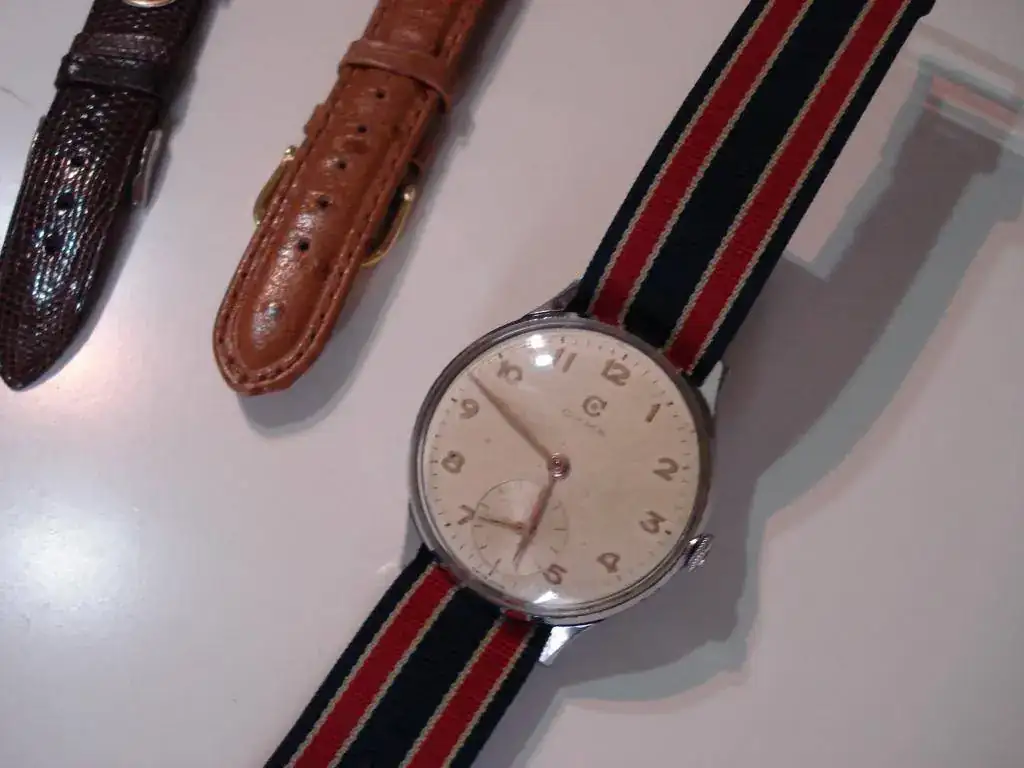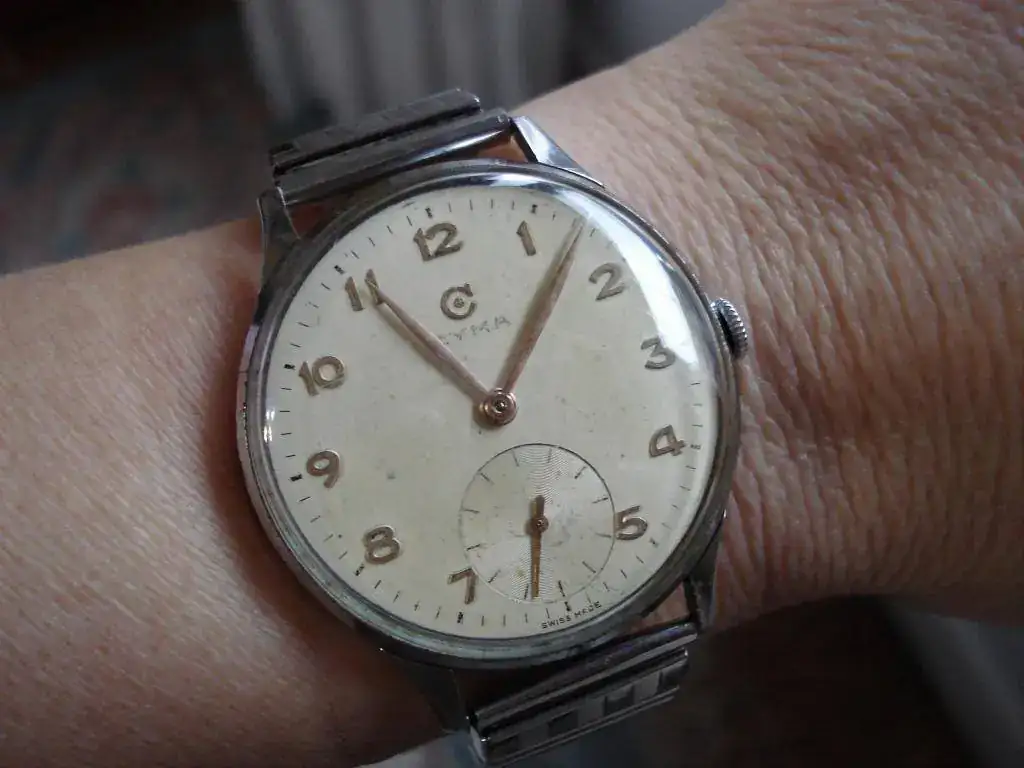No tengo nada claro que vaya a quitarle el brazalete elástico, porque me parece que le va fenomenal a la pieza. Además, me miro la muñeca y me parece talmente como me si me hubiese puesto el reloj de un tío abuelo al que adoraba. Y mis recuerdos relojeros de la infancia pasan por las muñecas a las que más me gustaba agarrarme de niña, y en ellas veo el Omega con milanesa de mi padre (lamentablemente robado hace unos años) y el Cyma con brazalete elástico de mi tío abuelo (que a saber dónde andará). Creo que soy razonablemente femenina y no daría pie a confusiones a pesar de esa imagen tan eminentemente masculina que le da al reloj; de hecho, incluso me atrae el contraste que hace tan grandullón y masculino en mí