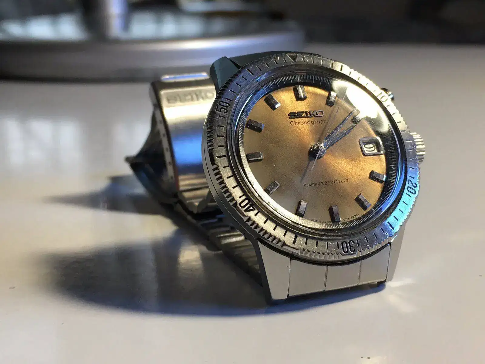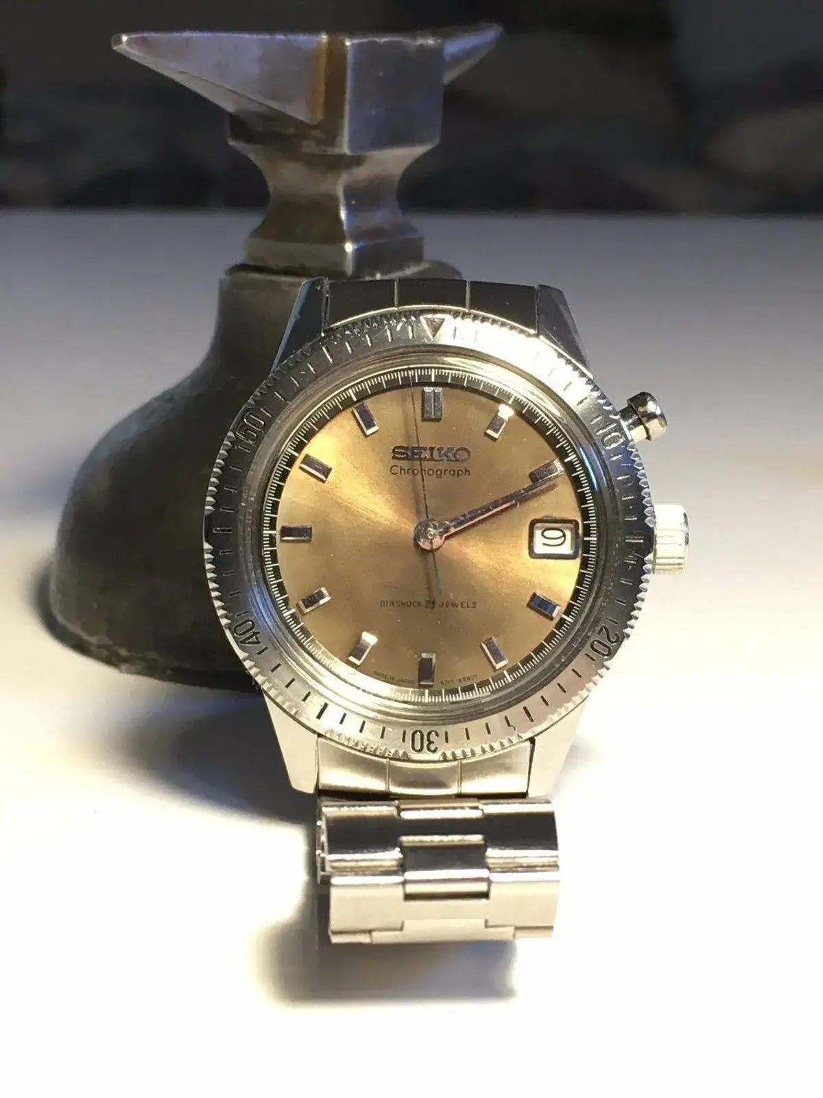 Yo este, recién llegado, un 5717 muy especial, cronógrafo mono pulsador de 1964, un seiko que se fabricó en esfera plateada y negra,. este lleva la primera pero con una patina asombrosa.